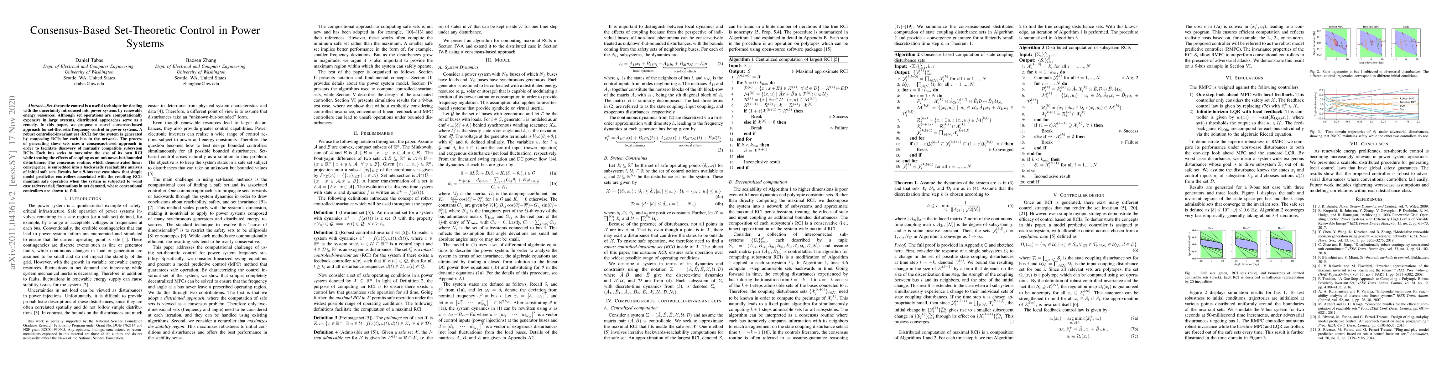 A novel consensus-based approach is proposed for set-theoretic control in power systems to handle uncertainty from renewable energy resources, with results showing that it can maintain safe operation even under adversarial fluctuations.