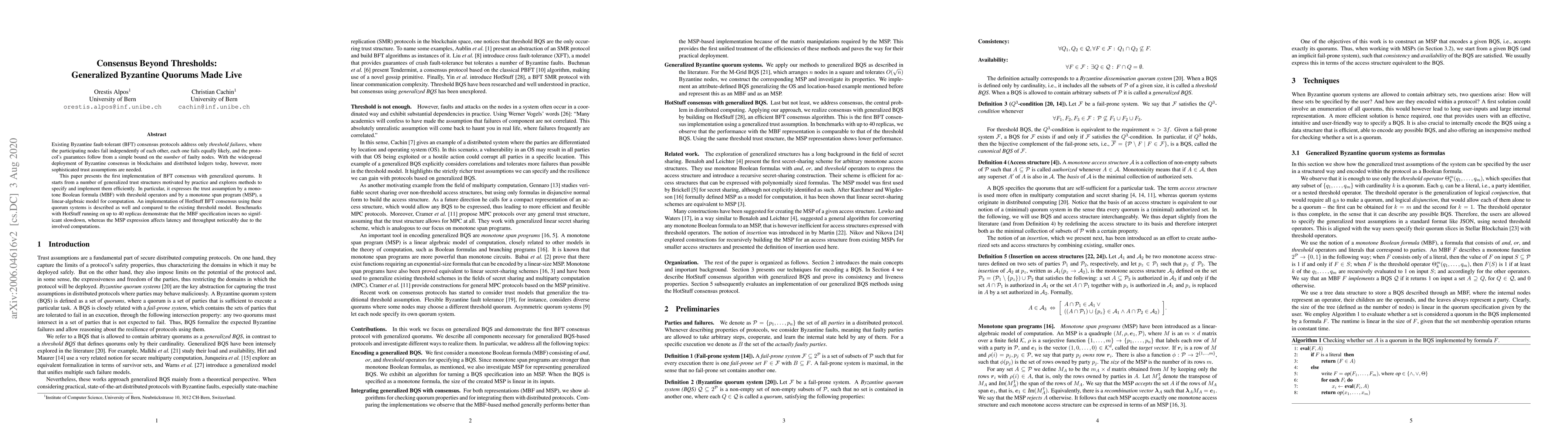 This paper introduces a novel implementation of Byzantine fault-tolerant consensus using generalized quorum systems, moving beyond simple threshold failures. It employs monotone Boolean formulas and monotone span programs to efficiently specify and implement these advanced trust structures, demonstrating comparable performance to the traditional threshold model in benchmarks.