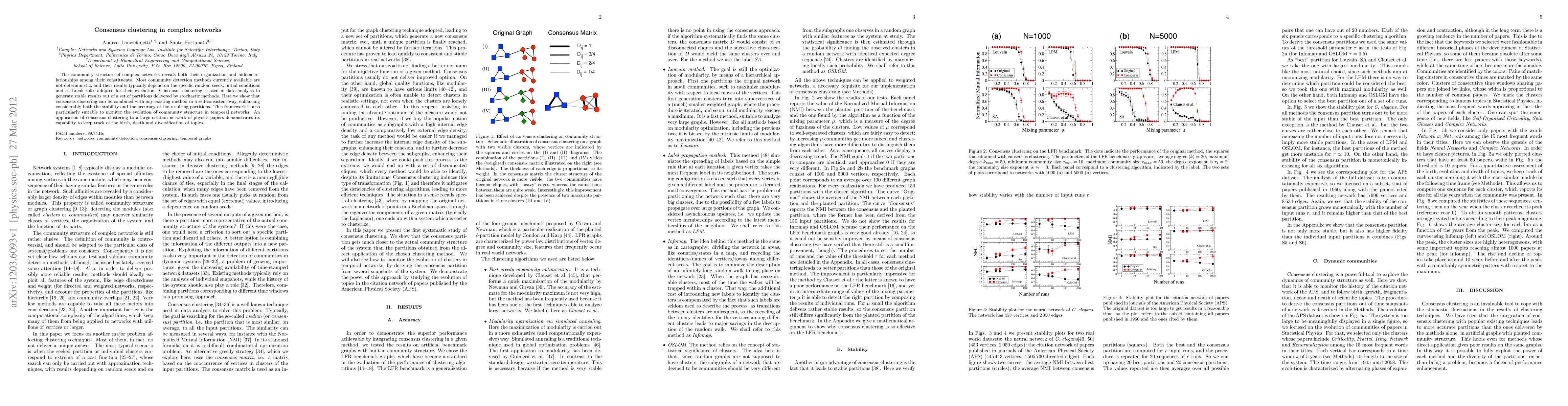 Consensus clustering enhances the stability and accuracy of community detection in complex networks by integrating results from multiple stochastic methods. This approach is particularly effective for monitoring dynamic changes in temporal networks, as demonstrated by its application to a large citation network of physics papers.