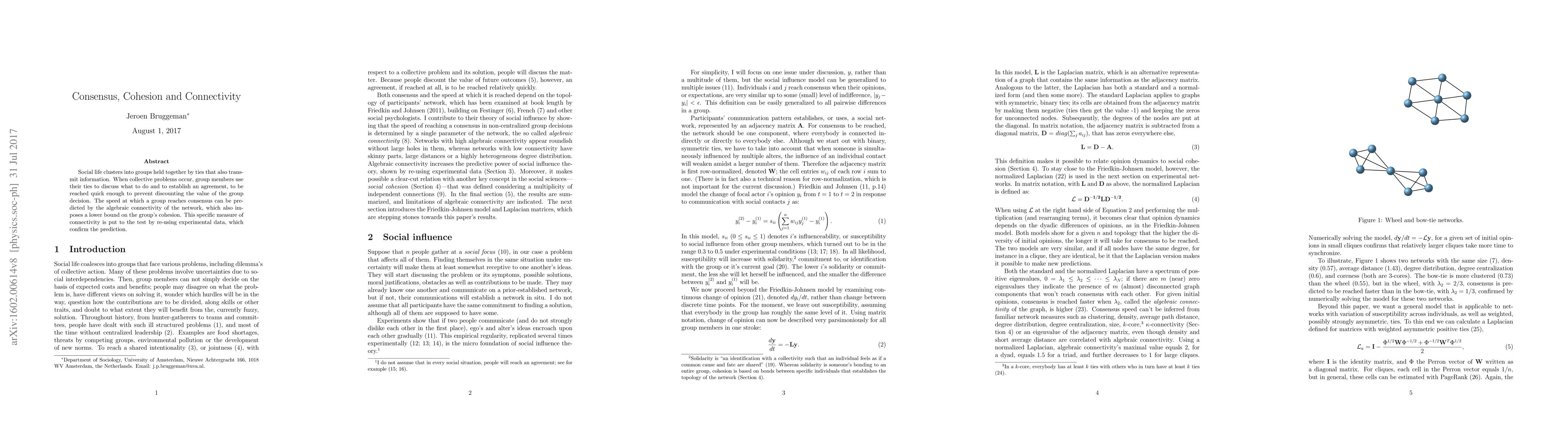 Social life clusters into groups held together by ties that also transmit information. When collective problems occur, group members use their ties to discuss what to do and to establish an agreement, to be reached quick enough to prevent discounting the value of the group decision. The speed at which a group reaches consensus can be predicted by the algebraic connectivity of the network, which also imposes a lower bound on the group's cohesion. This specific measure of connectivity is put to the test by re-using experimental data, which confirm the prediction.