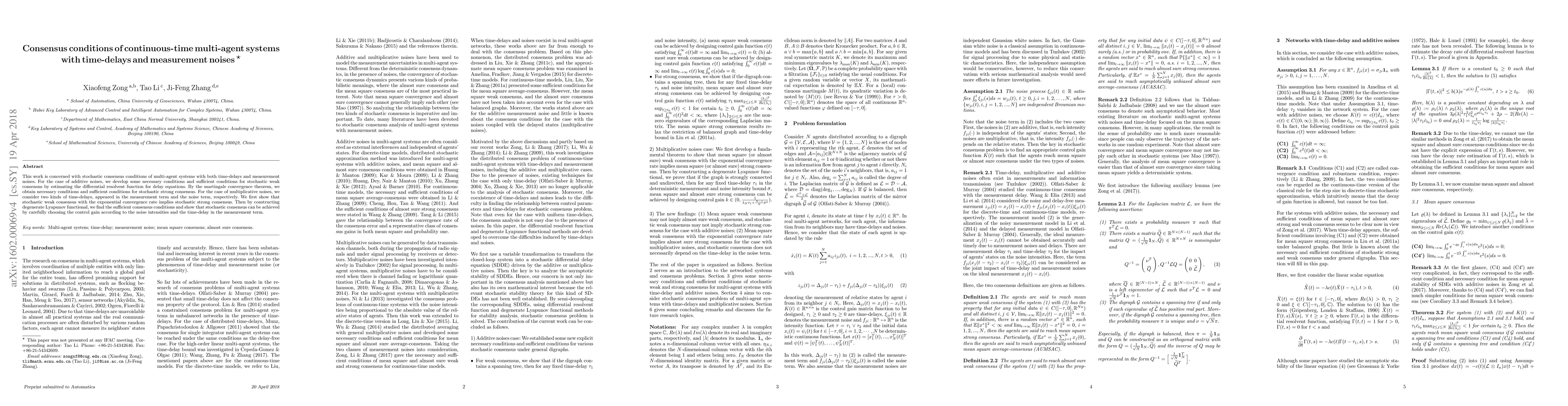 This paper explores stochastic consensus conditions for continuous-time multi-agent systems with time-delays and measurement noises, developing necessary and sufficient conditions for both weak and strong consensus under additive and multiplicative noise scenarios. It leverages differential resolvent functions and Lyapunov functionals to achieve consensus.