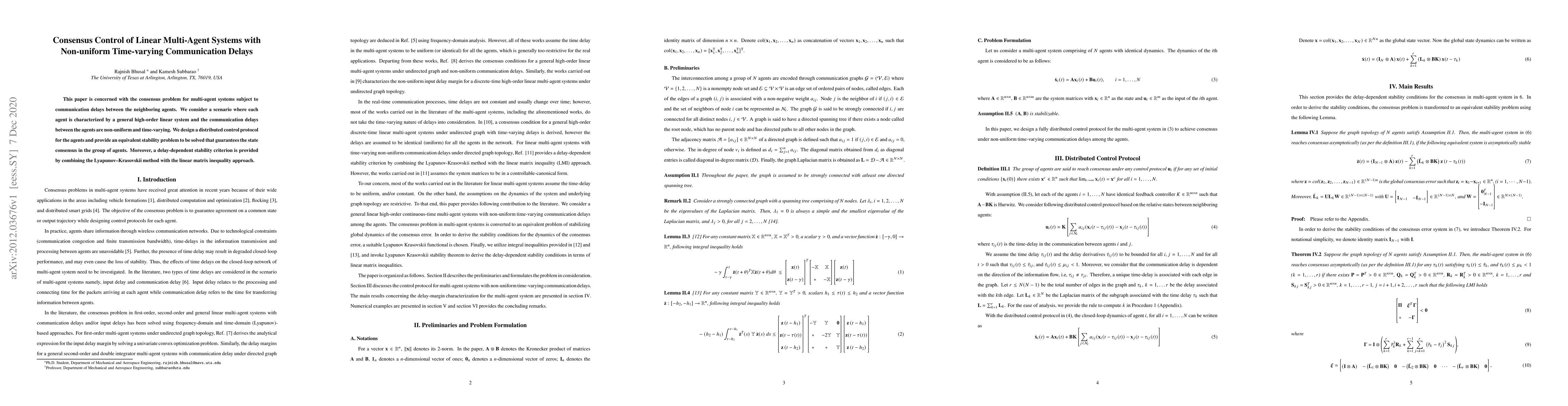 This paper addresses the consensus problem in multi-agent systems with non-uniform time-varying communication delays, proposing a distributed control protocol and a stability criterion using the Lyapunov-Krasovskii method and linear matrix inequalities to ensure state consensus.