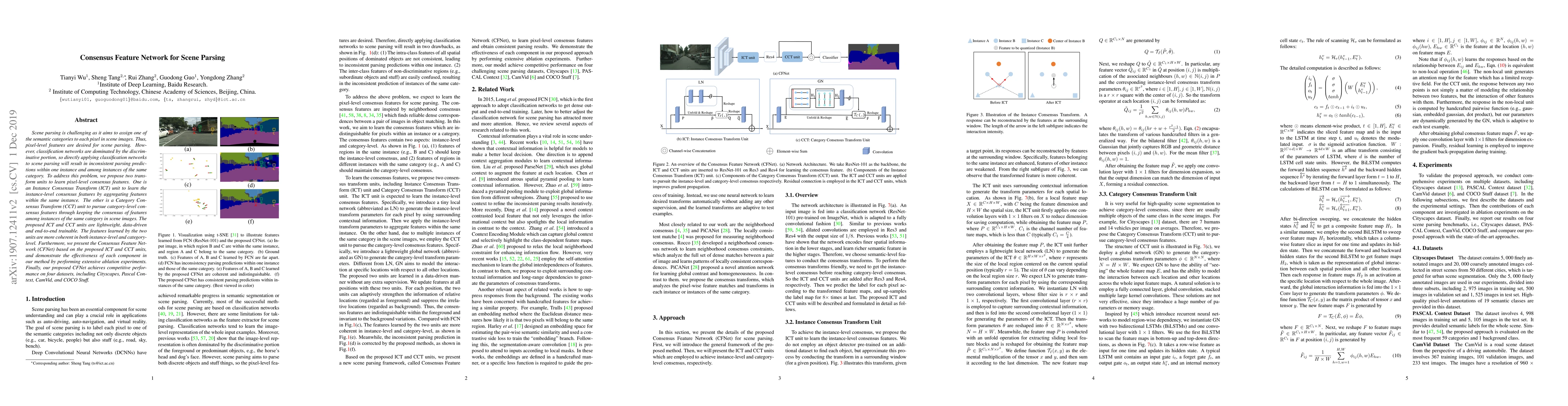 The paper proposes the Consensus Feature Network (CFNet) to enhance scene parsing by incorporating Instance Consensus Transform (ICT) and Category Consensus Transform (CCT) units, which learn coherent pixel-level features for both instance and category consistency, resulting in improved parsing accuracy across multiple datasets. The CFNet demonstrates competitive performance on standard benchmarks.