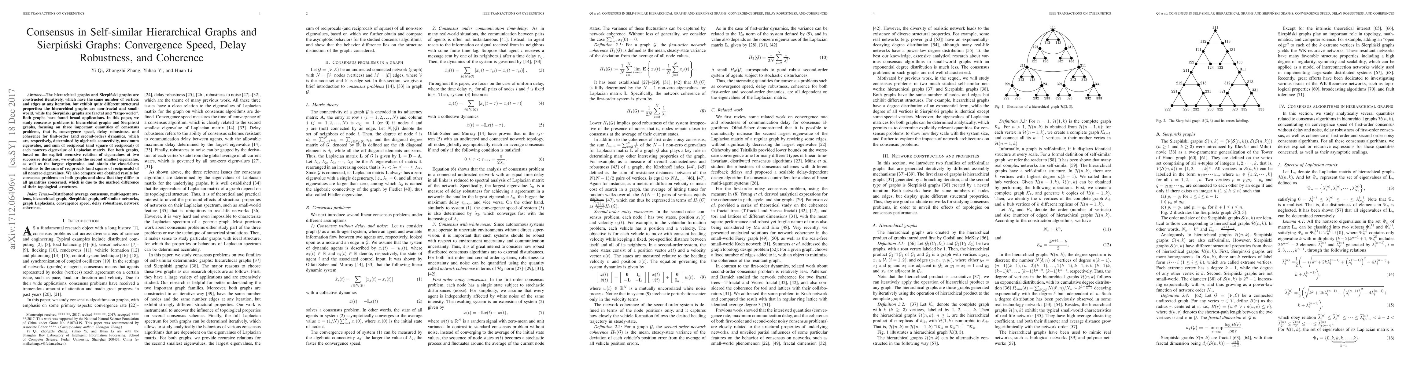 The paper studies consensus problems in self-similar hierarchical graphs and Sierpiński graphs, focusing on convergence speed, delay robustness, and coherence for first-order and second-order dynamics. It derives explicit recursive relations for eigenvalues of Laplacian matrices at successive iterations for both graph types.