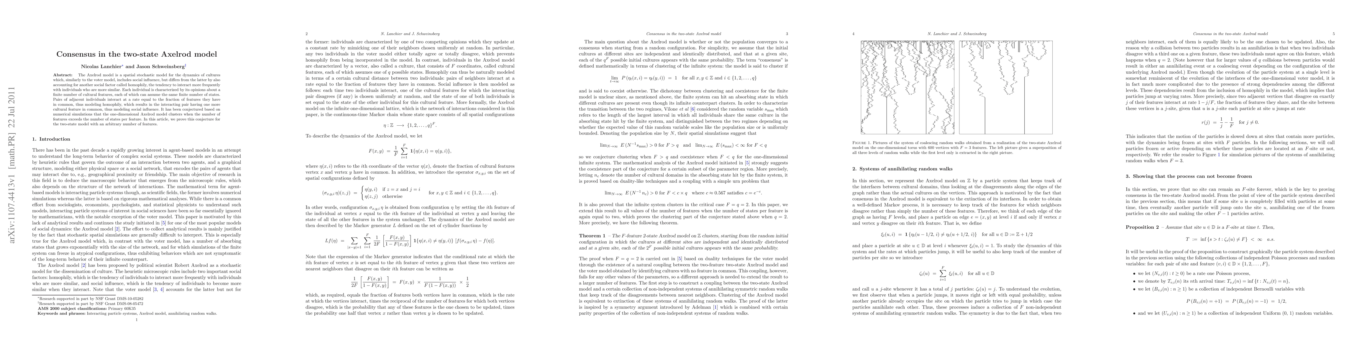 The two-state Axelrod model clusters when the number of features exceeds the number of states per feature, according to a proof for the two-state model with an arbitrary number of features.