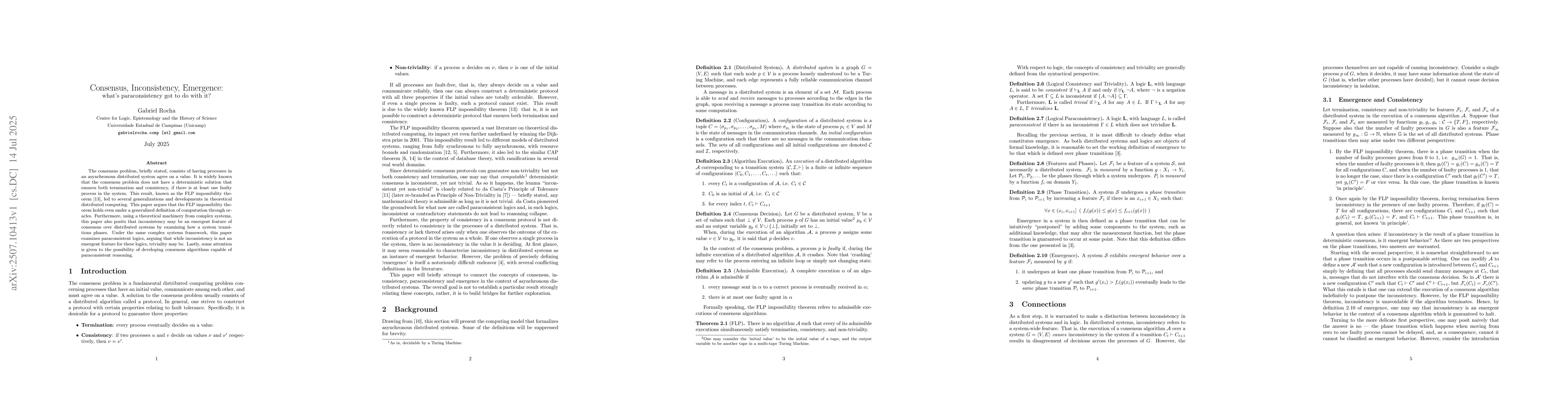The paper proposes a novel perspective on the FLP impossibility theorem, suggesting that inconsistency in distributed systems can be viewed as an emergent feature, and examines the relationship between paraconsistent logics and emergence.
