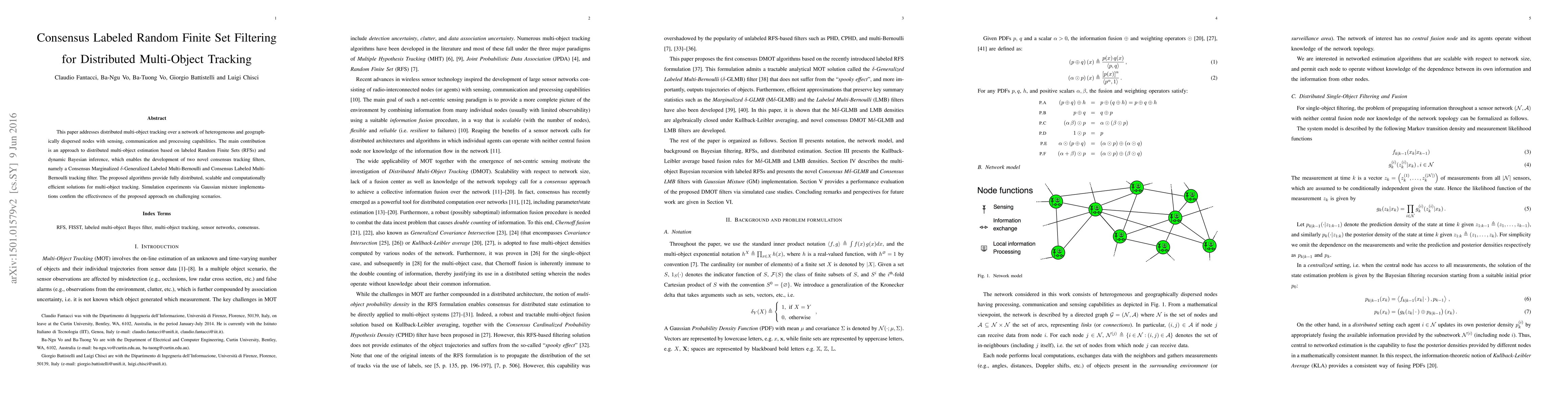 This paper proposes consensus labeled Random Finite Set filtering for distributed multi-object tracking across heterogeneous nodes, introducing two novel consensus tracking filters. Simulation results demonstrate the effectiveness of the proposed scalable and computationally efficient algorithms in challenging tracking scenarios.
