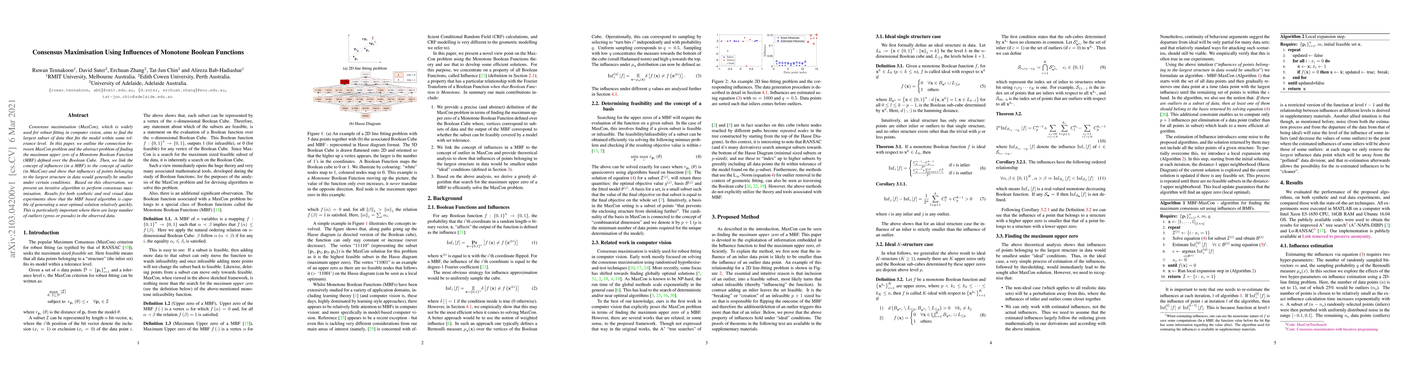 This paper connects consensus maximisation (MaxCon) with finding the maximum upper zero of a Monotone Boolean Function (MBF), proposing that influences in MBF relate to outliers in MaxCon. An iterative algorithm leveraging this connection efficiently finds the largest subset of data fitting a model, demonstrating near-optimal performance in both synthetic and real visual data experiments.