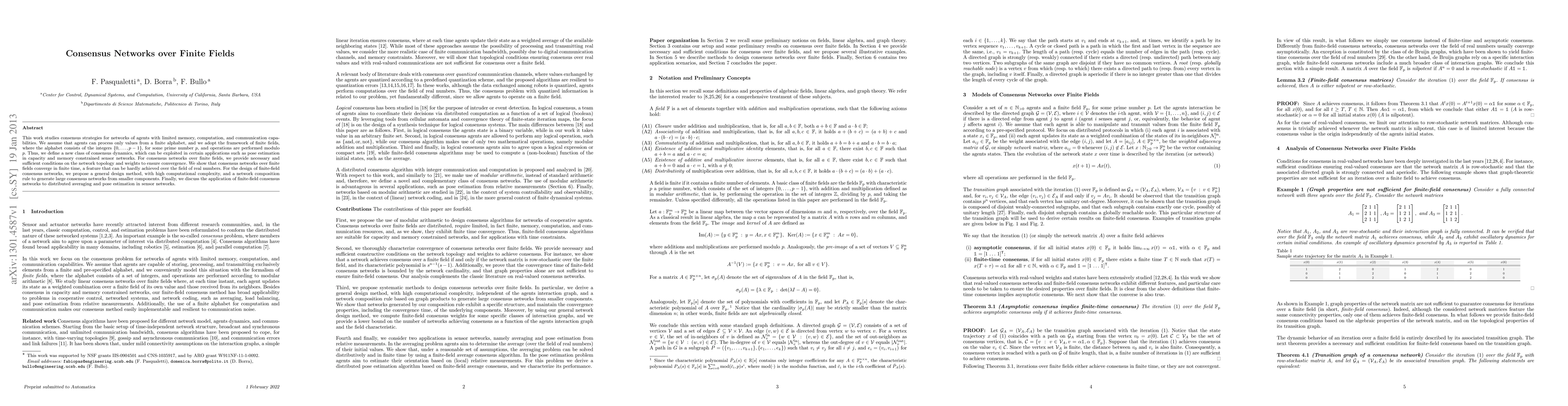 Researchers developed consensus networks over finite fields with limited memory, computation, and communication capabilities, enabling faster convergence than in real numbers, with potential applications in pose estimation and distributed averaging in sensor networks.