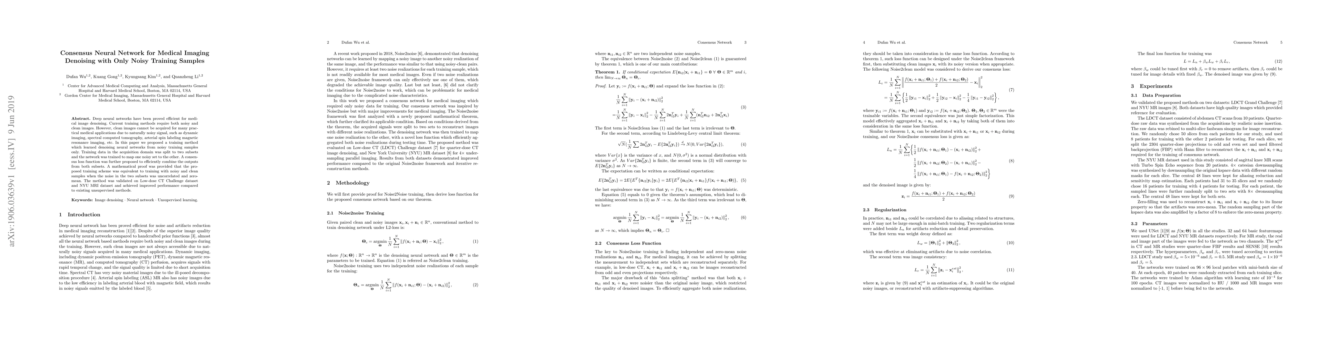 This paper proposes a novel training method for denoising neural networks using only noisy training samples, splitting training data into two subsets and employing a consensus loss function. This method achieves equivalent performance to training with clean samples under certain conditions, validated on CT and MRI datasets.