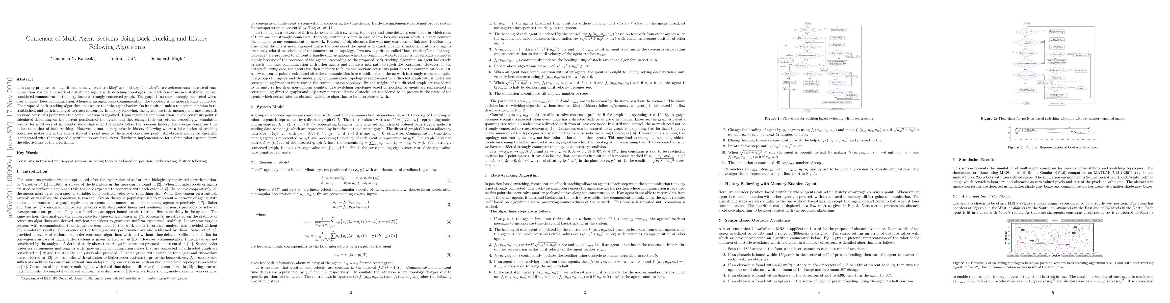 This paper introduces "back-tracking" and "history following" algorithms to achieve consensus in multi-agent systems with communication loss and switching topologies. The back-tracking algorithm ensures agents revert to previous positions until communication is restored, while the history following algorithm uses memory to reach previous consensus points. Simulation results indicate history following reduces average consensus time but may lead to false consensus, and an obstacle avoidance mechanism is integrated for practical implementation.