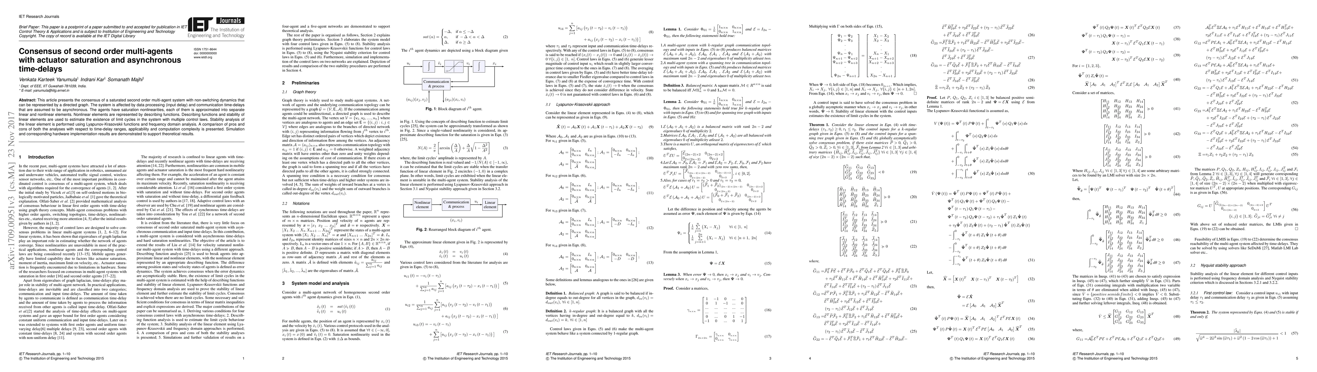 This paper investigates the consensus of a second-order multi-agent system with actuator saturation and asynchronous time-delays, providing stability analysis and simulation results to support theoretical findings.