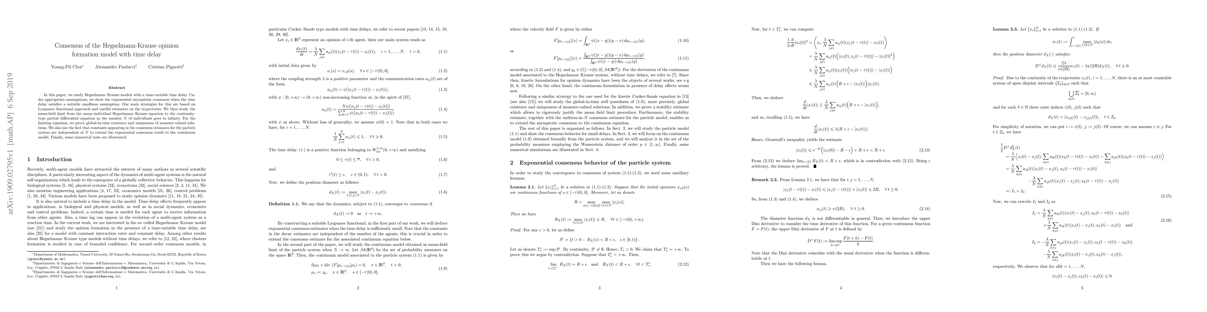 This paper investigates the Hegselmann-Krause model with time-variable delays, proving exponential asymptotic consensus under smallness conditions using Lyapunov functionals and trajectory estimates. It also explores the mean-field limit and proves global-in-time existence and uniqueness of measure-valued solutions for the continuum model.