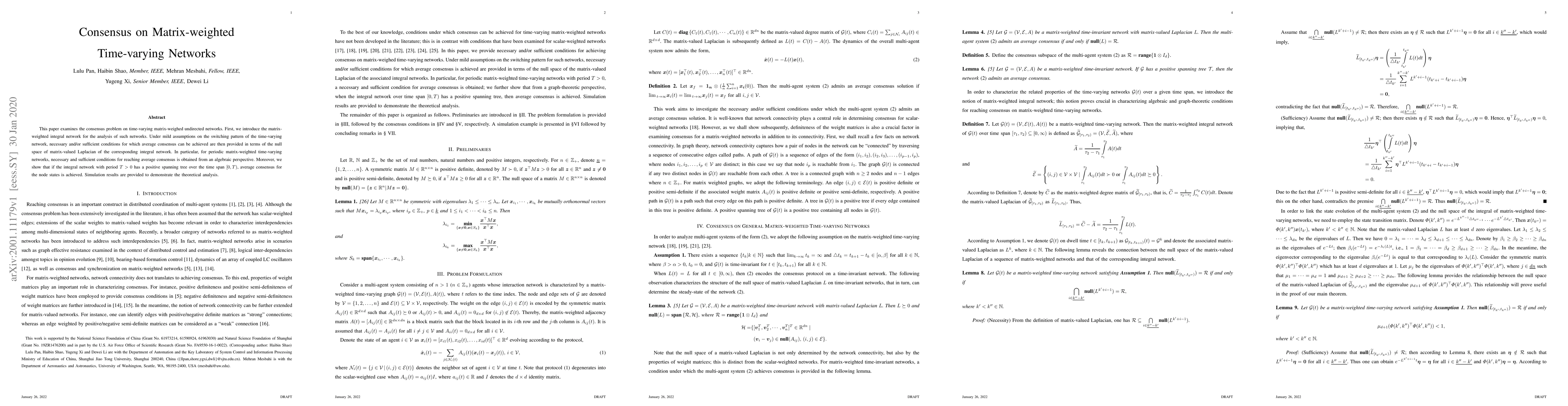 This paper examines the consensus problem on time-varying matrix-weighed undirected networks. First, we introduce the matrix-weighted integral network for the analysis of such networks. Under mild assumptions on the switching pattern of the time-varying network, necessary and/or sufficient conditions for which average consensus can be achieved are then provided in terms of the null space of matrix-valued Laplacian of the corresponding integral network. In particular, for periodic matrix-weighted time-varying networks, necessary and sufficient conditions for reaching average consensus is obtained from an algebraic perspective. Moreover, we show that if the integral network with period $T>0$ has a positive spanning tree over the time span $[0,T)$, average consensus for the node states is achieved. Simulation results are provided to demonstrate the theoretical analysis.