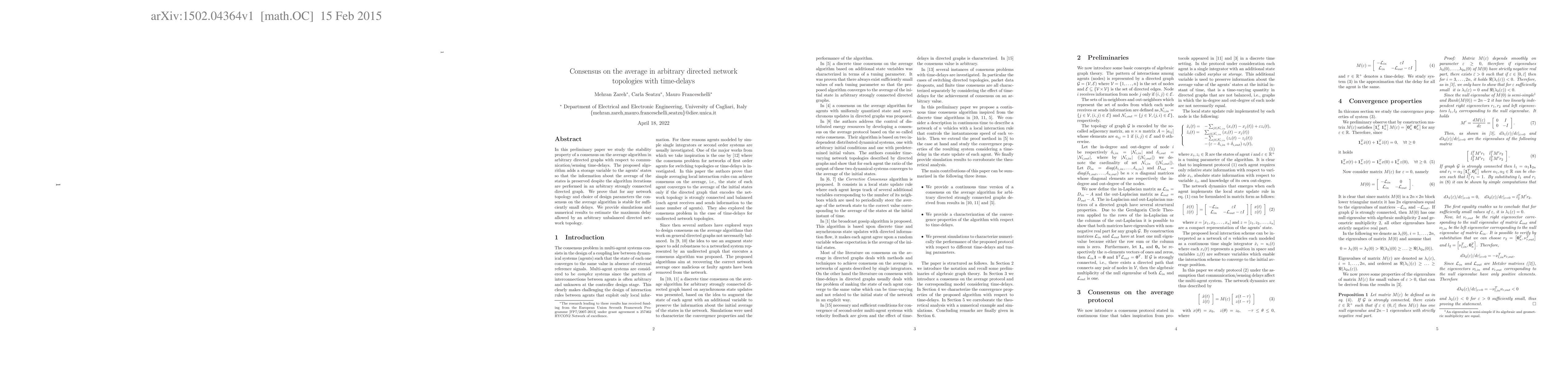 This paper investigates the stability of a consensus on the average algorithm in arbitrary directed graphs with time-delays. The proposed algorithm incorporates a storage variable to maintain average state information, ensuring stability for sufficiently small delays across any network topology.