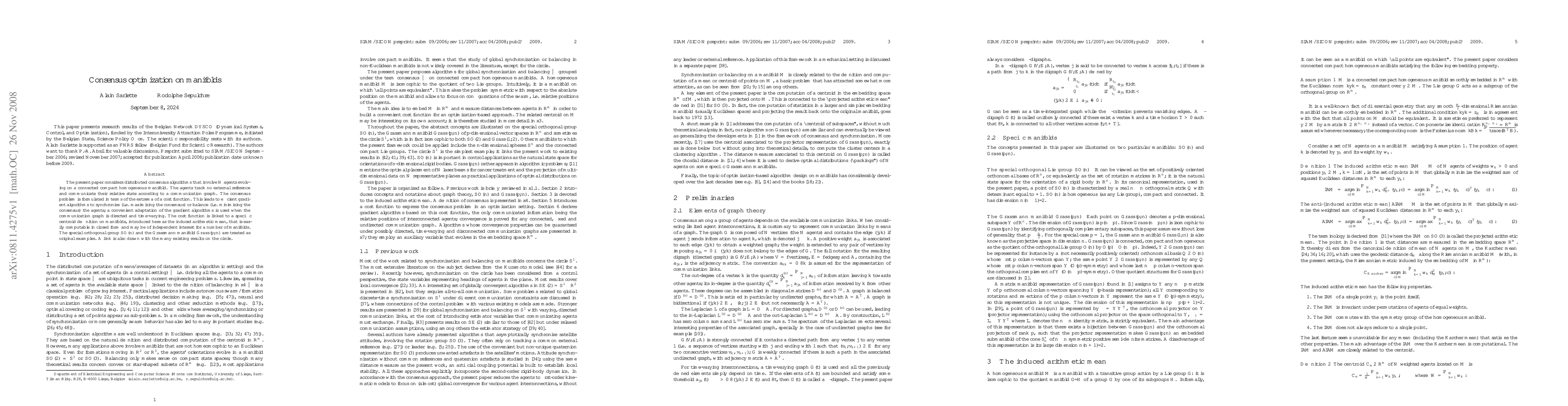 The present paper considers distributed consensus algorithms that involve N agents evolving on a connected compact homogeneous manifold. The agents track no external reference and communicate their relative state according to a communication graph. The consensus problem is formulated in terms of the extrema of a cost function. This leads to efficient gradient algorithms to synchronize (i.e. maximizing the consensus) or balance (i.e. minimizing the consensus) the agents; a convenient adaptation of the gradient algorithms is used when the communication graph is directed and time-varying. The cost function is linked to a specific centroid definition on manifolds, introduced here as the induced arithmetic mean, that is easily computable in closed form and may be of independent interest for a number of manifolds. The special orthogonal group SO(n) and the Grassmann manifold Gr(p,n) are treated as original examples. A link is also drawn with the many existing results on the circle.