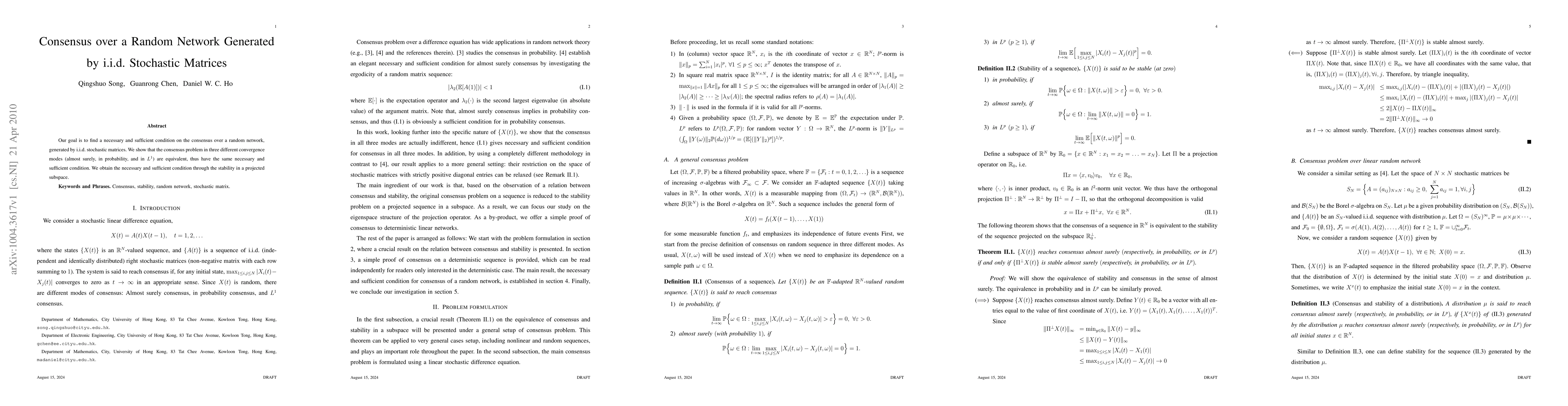 Our goal is to find a necessary and sufficient condition on the consensus over a random network, generated by i.i.d. stochastic matrices. We show that the consensus problem in three different convergence modes (almost surely, in probability, and in L1) are equivalent, thus have the same necessary and sufficient condition. We obtain the necessary and sufficient condition through the stability in a projected subspace.