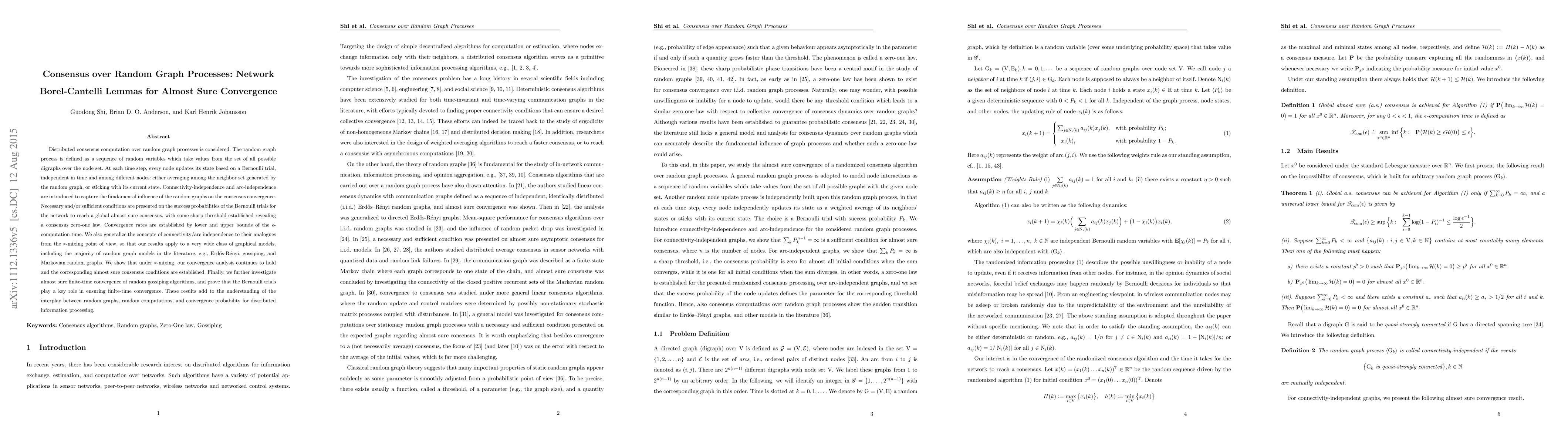 Distributed consensus computation over random graph processes is considered. The random graph process is defined as a sequence of random variables which take values from the set of all possible digraphs over the node set. At each time step, every node updates its state based on a Bernoulli trial, independent in time and among different nodes: either averaging among the neighbor set generated by the random graph, or sticking with its current state. Connectivity-independence and arc-independence are introduced to capture the fundamental influence of the random graphs on the consensus convergence. Necessary and/or sufficient conditions are presented on the success probabilities of the Bernoulli trials for the network to reach a global almost sure consensus, with some sharp threshold established revealing a consensus zero-one law. Convergence rates are established by lower and upper bounds of the $\epsilon$-computation time. We also generalize the concepts of connectivity/arc independence to their analogues from the $*$-mixing point of view, so that our results apply to a very wide class of graphical models, including the majority of random graph models in the literature, e.g., Erd\H{o}s-R\'{e}nyi, gossiping, and Markovian random graphs. We show that under $*$-mixing, our convergence analysis continues to hold and the corresponding almost sure consensus conditions are established. Finally, we further investigate almost sure finite-time convergence of random gossiping algorithms, and prove that the Bernoulli trials play a key role in ensuring finite-time convergence. These results add to the understanding of the interplay between random graphs, random computations, and convergence probability for distributed information processing.
