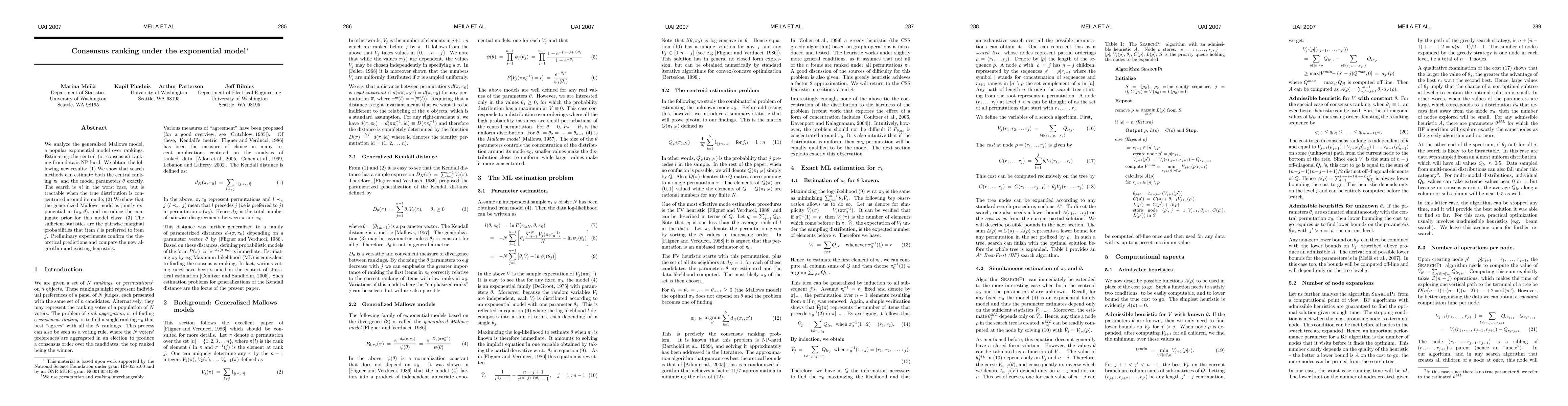 We analyze the generalized Mallows model, a popular exponential model over rankings. Estimating the central (or consensus) ranking from data is NP-hard. We obtain the following new results: (1) We show that search methods can estimate both the central ranking pi0 and the model parameters theta exactly. The search is n! in the worst case, but is tractable when the true distribution is concentrated around its mode; (2) We show that the generalized Mallows model is jointly exponential in (pi0; theta), and introduce the conjugate prior for this model class; (3) The sufficient statistics are the pairwise marginal probabilities that item i is preferred to item j. Preliminary experiments confirm the theoretical predictions and compare the new algorithm and existing heuristics.