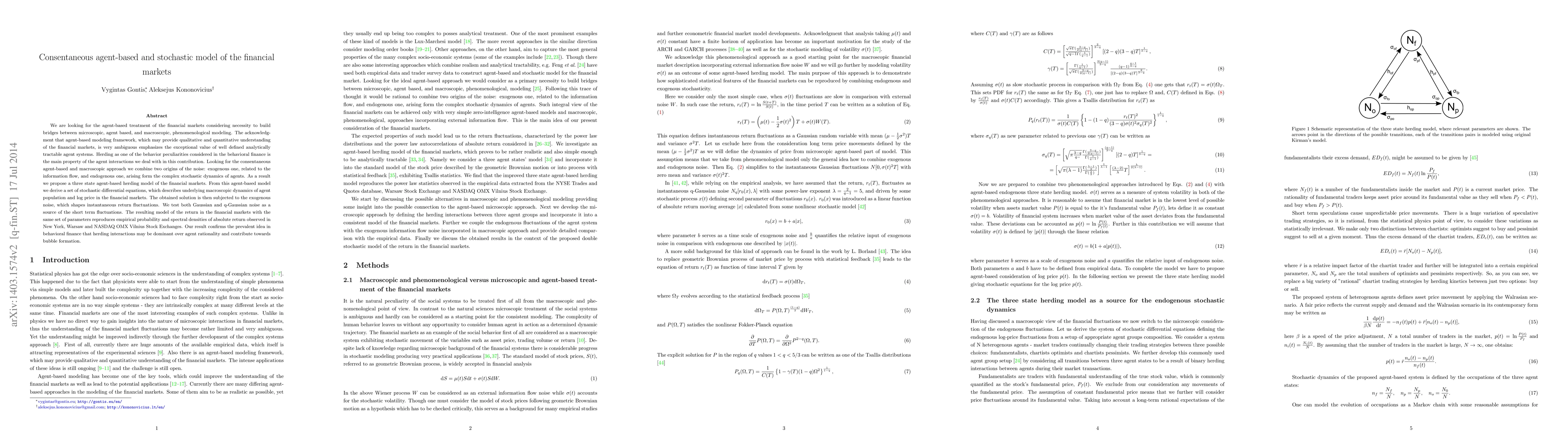 We are looking for the agent-based treatment of the financial markets considering necessity to build bridges between microscopic, agent based, and macroscopic, phenomenological modeling. The acknowledgment that agent-based modeling framework, which may provide qualitative and quantitative understanding of the financial markets, is very ambiguous emphasizes the exceptional value of well defined analytically tractable agent systems. Herding as one of the behavior peculiarities considered in the behavioral finance is the main property of the agent interactions we deal with in this contribution. Looking for the consentaneous agent-based and macroscopic approach we combine two origins of the noise: exogenous one, related to the information flow, and endogenous one, arising form the complex stochastic dynamics of agents. As a result we propose a three state agent-based herding model of the financial markets. From this agent-based model we derive a set of stochastic differential equations, which describes underlying macroscopic dynamics of agent population and log price in the financial markets. The obtained solution is then subjected to the exogenous noise, which shapes instantaneous return fluctuations. We test both Gaussian and q-Gaussian noise as a source of the short term fluctuations. The resulting model of the return in the financial markets with the same set of parameters reproduces empirical probability and spectral densities of absolute return observed in New York, Warsaw and NASDAQ OMX Vilnius Stock Exchanges. Our result confirms the prevalent idea in behavioral finance that herding interactions may be dominant over agent rationality and contribute towards bubble formation.