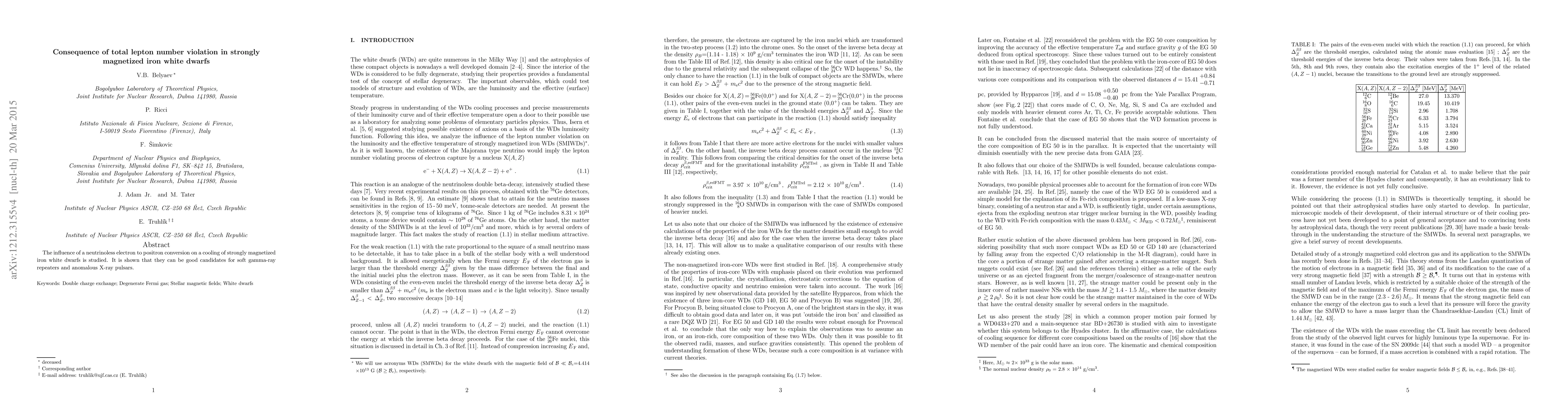 Summary: This study investigates the impact of neutrinoless electron to positron conversion on the cooling of strongly magnetized iron white dwarfs, suggesting they may serve as potential sources for soft gamma-ray repeaters and anomalous X-ray pulsars.