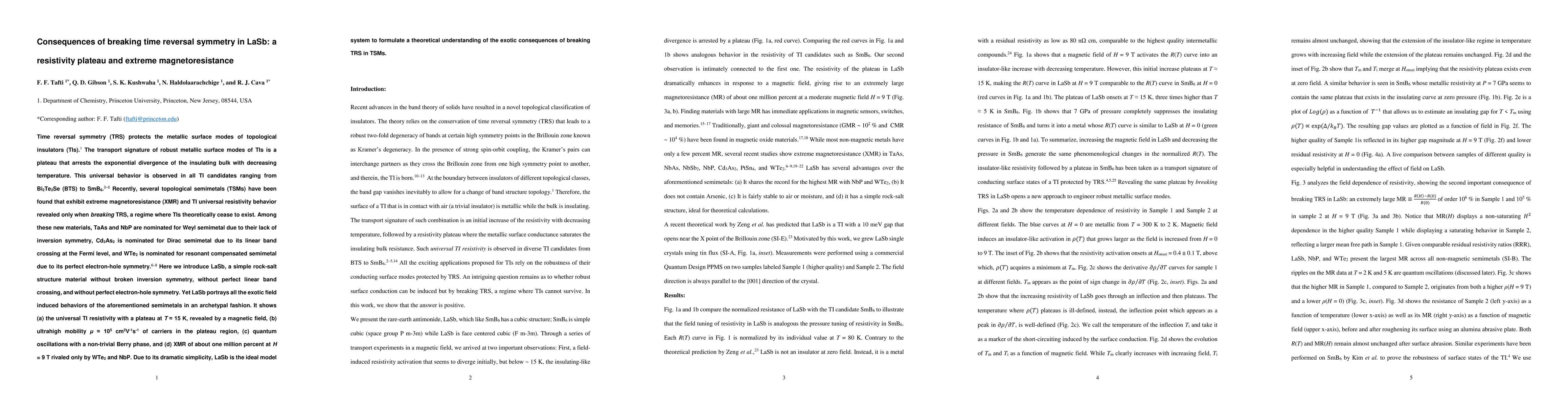 LaSb exhibits universal resistivity with a plateau at 15 K, ultrahigh mobility, quantum oscillations, and extreme magnetoresistance, making it an ideal model system to understand the consequences of breaking time reversal symmetry in topological semimetals.