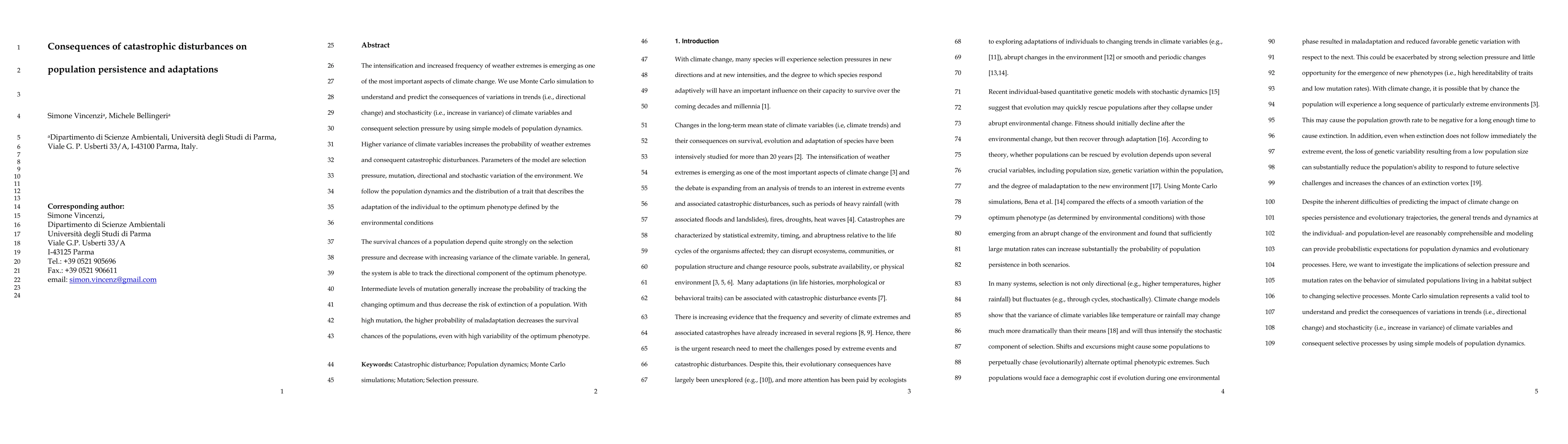 The intensification and increased frequency of weather extremes is emerging as one of the most important aspects of climate change. We use Monte Carlo simulation to understand and predict the consequences of variations in trends (i.e., directional change) and stochasticity (i.e., increase in variance) of climate variables and consequent selection pressure by using simple models of population dynamics. Higher variance of climate variables increases the probability of weather extremes and consequent catastrophic disturbances. Parameters of the model are selection pressure, mutation, directional and stochastic variation of the environment. We follow the population dynamics and the distribution of a trait that describes the adaptation of the individual to the optimum phenotype defined by the environmental conditions. The survival chances of a population depend quite strongly on the selection pressure and decrease with increasing variance of the climate variable. In general, the system is able to track the directional component of the optimum phenotype. Intermediate levels of mutation generally increase the probability of tracking the changing optimum and thus decrease the risk of extinction of a population. With high mutation, the higher probability of maladaptation decreases the survival chances of the populations, even with high variability of the optimum phenotype.