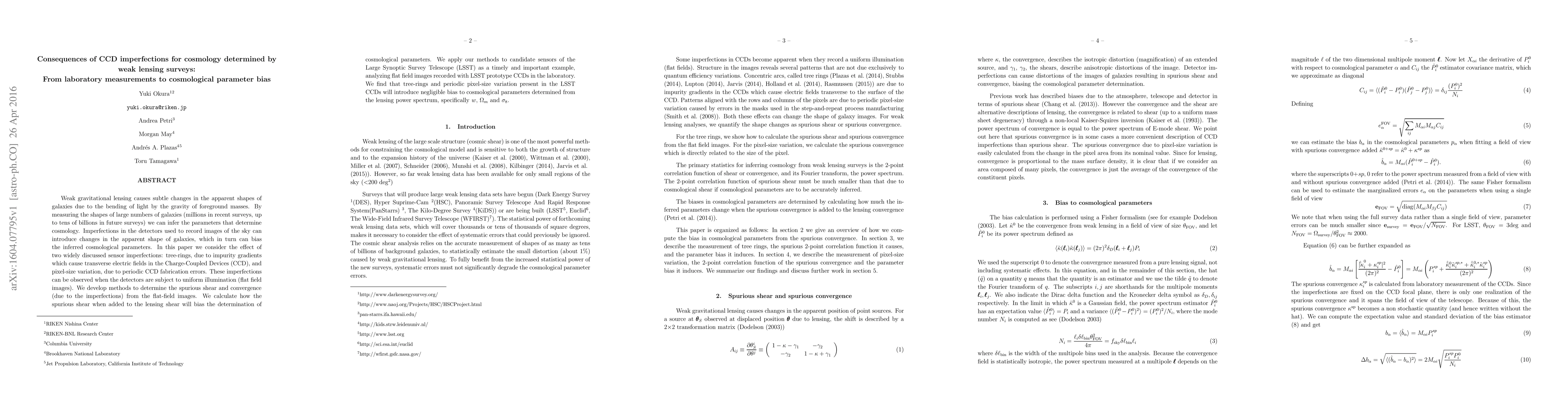 Weak gravitational lensing causes subtle changes in the apparent shapes of galaxies due to the bending of light by the gravity of foreground masses. By measuring the shapes of large numbers of galaxies (millions in recent surveys, up to tens of billions in future surveys) we can infer the parameters that determine cosmology. Imperfections in the detectors used to record images of the sky can introduce changes in the apparent shape of galaxies, which in turn can bias the inferred cosmological parameters. In this paper we consider the effect of two widely discussed sensor imperfections: tree-rings, due to impurity gradients which cause transverse electric fields in the Charge-Coupled Devices (CCD), and pixel-size variation, due to periodic CCD fabrication errors. These imperfections can be observed when the detectors are subject to uniform illumination (flat field images). We develop methods to determine the spurious shear and convergence (due to the imperfections) from the flat-field images. We calculate how the spurious shear when added to the lensing shear will bias the determination of cosmological parameters. We apply our methods to candidate sensors of the Large Synoptic Survey Telescope (LSST) as a timely and important example, analyzing flat field images recorded with LSST prototype CCDs in the laboratory. We find that tree-rings and periodic pixel-size variation present in the LSST CCDs will introduce negligible bias to cosmological parameters determined from the lensing power spectrum, specifically w, {\Omega}m and {\sigma}8.