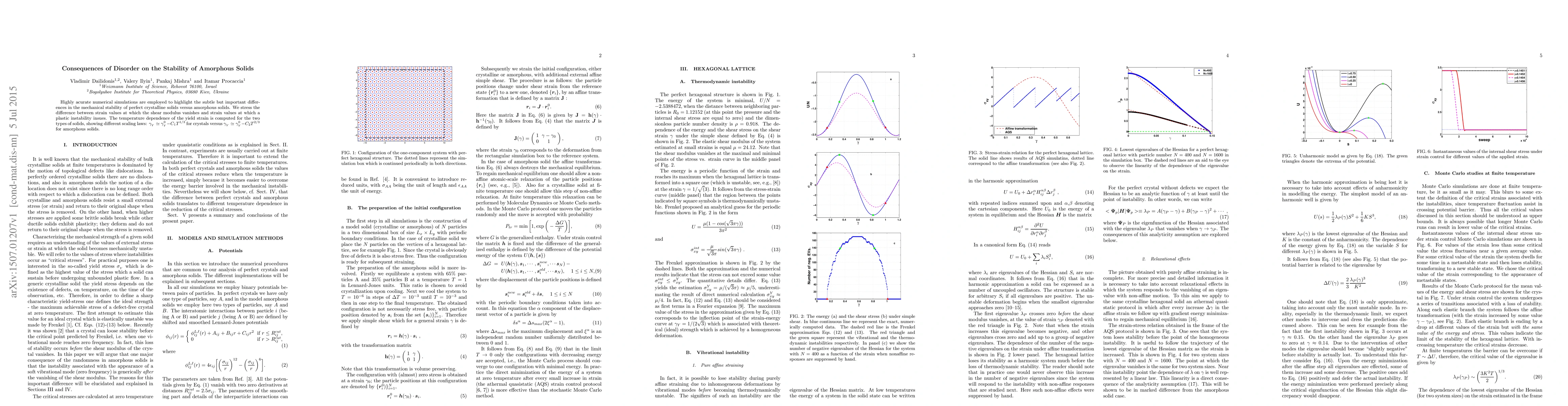 Highly accurate numerical simulations are employed to analyze the mechanical stability differences between perfect crystalline solids and amorphous solids, focusing on strain values at which shear modulus vanishes and plastic instability occurs.