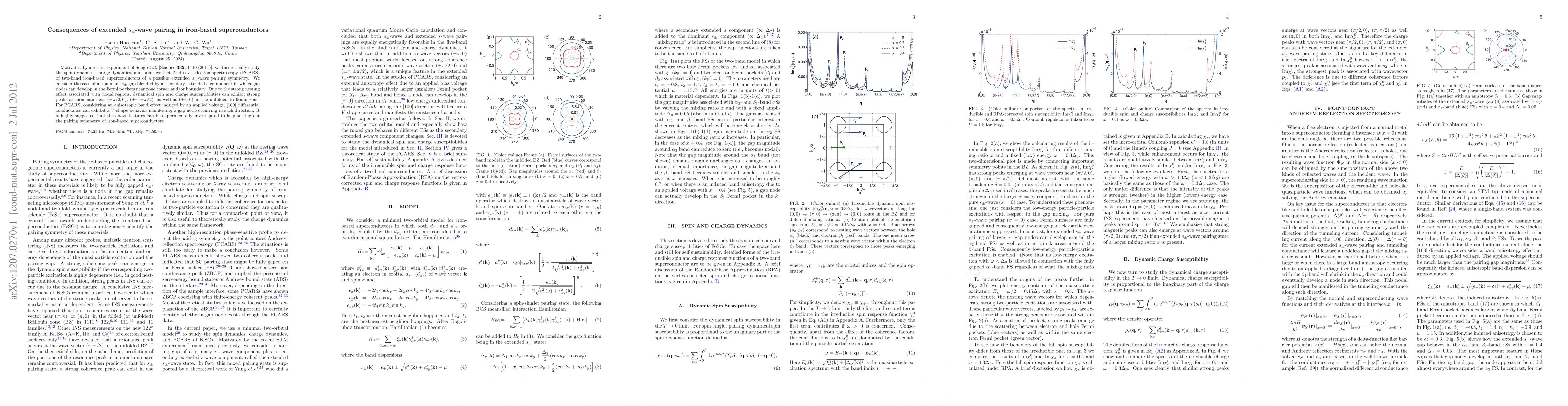 This paper theoretically investigates the spin and charge dynamics, as well as point-contact Andreev-reflection spectroscopy of two-band iron-based superconductors with an extended $s_\pm$-wave pairing symmetry. It suggests that strong peaks in spin and charge susceptibilities and a $V$-shaped differential conductance in PCARS can be experimental signatures of the proposed pairing symmetry.