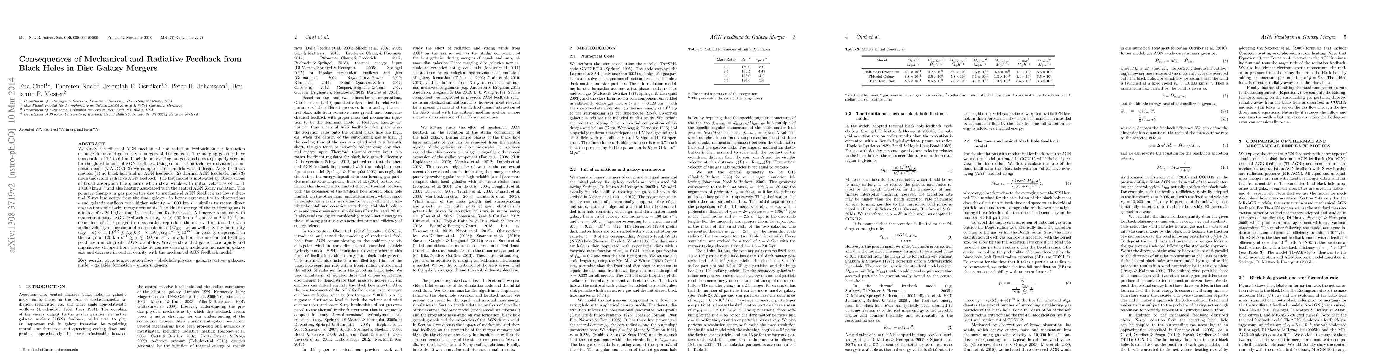 We study the effect of AGN mechanical and radiation feedback on the formation of bulge dominated galaxies via mergers of disc galaxies. The merging galaxies have mass-ratios of 1:1 to 6:1 and include pre-existing hot gaseous halos to properly account for the global impact of AGN feedback. Using smoothed particle hydrodynamics simulation code (GADGET-3) we compare three models with different AGN feedback models: (1) no black hole and no AGN feedback; (2) thermal AGN feedback; and (3) mechanical and radiative AGN feedback. The last model is motivated by observations of broad line quasars which show winds with initial velocities of $v_w \ge$ 10,000 km/s and also heating associated with the central AGN X-ray radiation. The primary changes in gas properties due to mechanical AGN feedback are lower thermal X-ray luminosity from the final galaxy - in better agreement with observations - and galactic outflows with higher velocity $\sim 1000$ km/s similar to recent direct observations of nearby merger remnants. The kinetic energy of the outflowing gas is a factor of $\sim$ 20 higher than in the thermal feedback case. All merger remnants with momentum-based AGN feedback with $v_w \sim 10,000$ km/s and $\epsilon_w=2 \times 10^{-3}$, independent of their progenitor mass-ratios, reproduce the observed relations between stellar velocity dispersion and black hole mass ($M_{\rm bh} - \sigma$) as well as X-ray luminosity ($L_X - \sigma$) with $10^{37.5}$ erg/s $\lesssim L_X (0.3-8~{\rm keV}) \lesssim 10^{39.2}$ erg/s for velocity dispersions in the range of 120 km/s $\lesssim \sigma \lesssim$ 190 km/s. In addition, the mechanical feedback produces a much greater AGN variability. We also show that gas is more rapidly and impulsively stripped from the galactic centres driving a moderate increase in galaxy size and decrease in central density with the mechanical AGN feedback model.