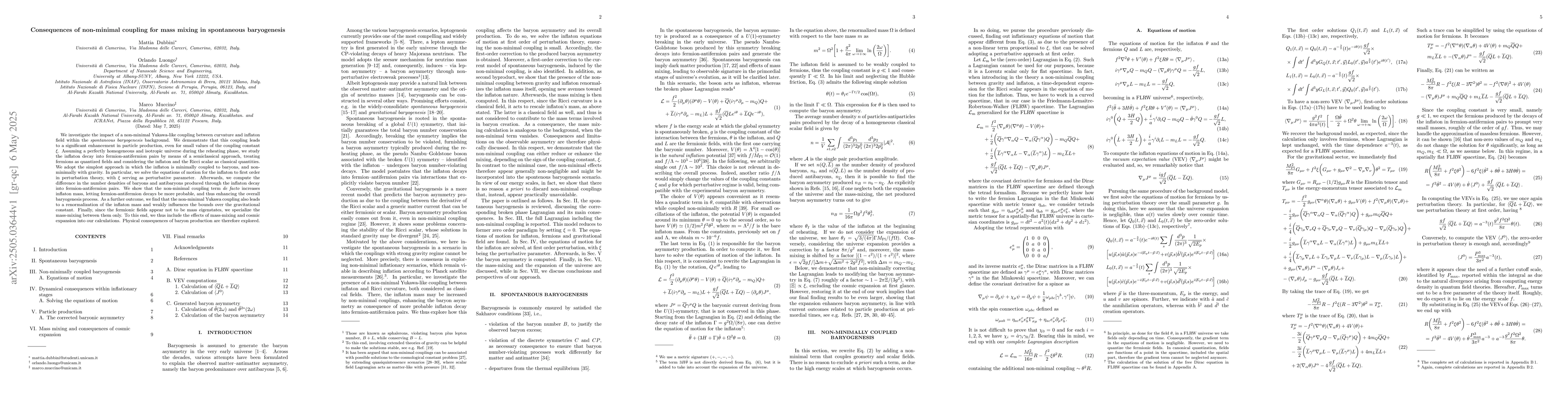 We investigate the impact of a non-minimal Yukawa-like coupling between curvature and inflaton field within the \emph{spontaneous baryogenesis} background. We demonstrate that this coupling leads to a significant enhancement in particle production, even for small values of the coupling constant $\xi$. Assuming a perfectly homogeneous and isotropic universe during the reheating phase, we study the inflaton decay into fermion-antifermion pairs by means of a semiclassical approach, treating fermions as quantized fields and considering the inflaton and the Ricci scalar as classical quantities. We adopt the simplest approach in which the inflaton is minimally coupled to baryons, and non-minimally with gravity. In particular, we solve the equations of motion for the inflaton to first order in perturbation theory, with $\xi$ serving as perturbative parameter. Afterwards, we compute the difference in the number densities of baryons and antibaryons produced through the inflaton decay into fermion-antifermion pairs. We show that the non-minimal coupling term \emph{de facto} increases inflaton mass, letting fermion-antifermion decays be more probable, and thus enhancing the overall baryogenesis process. As a further outcome, we find that the non-minimal Yukawa coupling also leads to a renormalization of the inflaton mass and weakly influences the bounds over the gravitational constant. Finally, since the fermionic fields appear not to be mass eigenstates, we specialize the mass-mixing between them only. To this end, we thus include the effects of mass-mixing and cosmic expansion into our calculations. Physical consequences of baryon production are therefore explored.