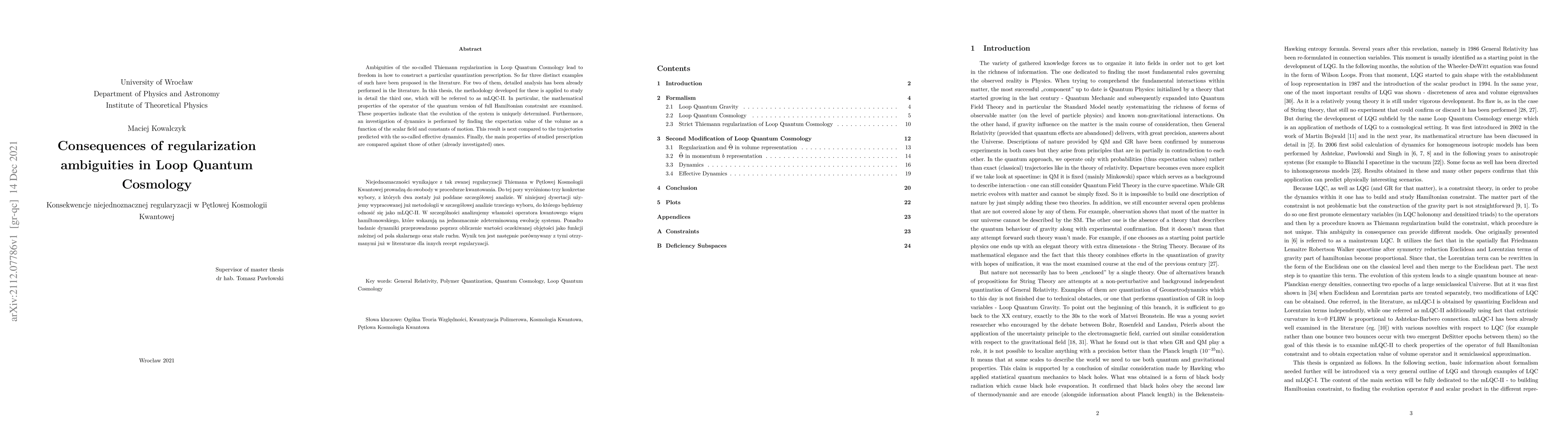 Ambiguities of the so-called Thiemann regularization in Loop Quantum Cosmology lead to freedom in how to construct a particular quantization prescription. So far three distinct examples of such have been proposed in the literature. For two of them, detailed analysis has been already performed in the literature. In this thesis, the methodology developed for these is applied to study in detail the third one, which will be referred to as mLQC-II. In particular, the mathematical properties of the operator of the quantum version of full Hamiltonian constraint are examined. These properties indicate that the evolution of the system is uniquely determined. Furthermore, an investigation of dynamics is performed by finding the expectation value of the volume as a function of the scalar field and constants of motion. This result is next compared to the trajectories predicted with the so-called effective dynamics. Finally, the main properties of studied prescription are compared against those of other (already investigated) ones.