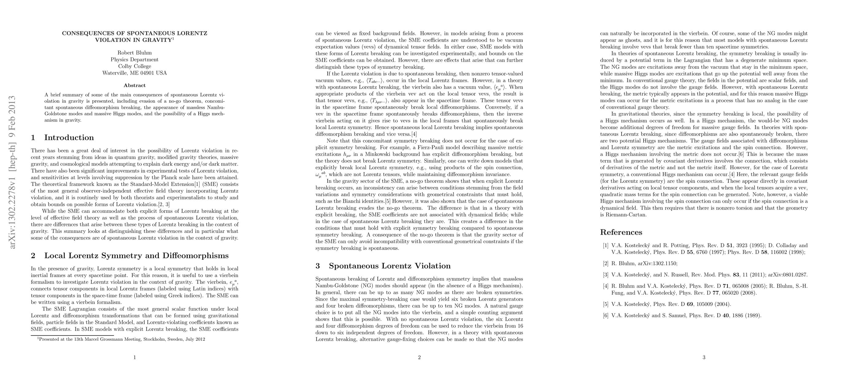 A brief summary of some of the main consequences of spontaneous Lorentz violation in gravity is presented, including evasion of a no-go theorem, concomitant spontaneous diffeomorphism breaking, the appearance of massless Nambu-Goldstone modes and massive Higgs modes, and the possibility of a Higgs mechanism in gravity.
