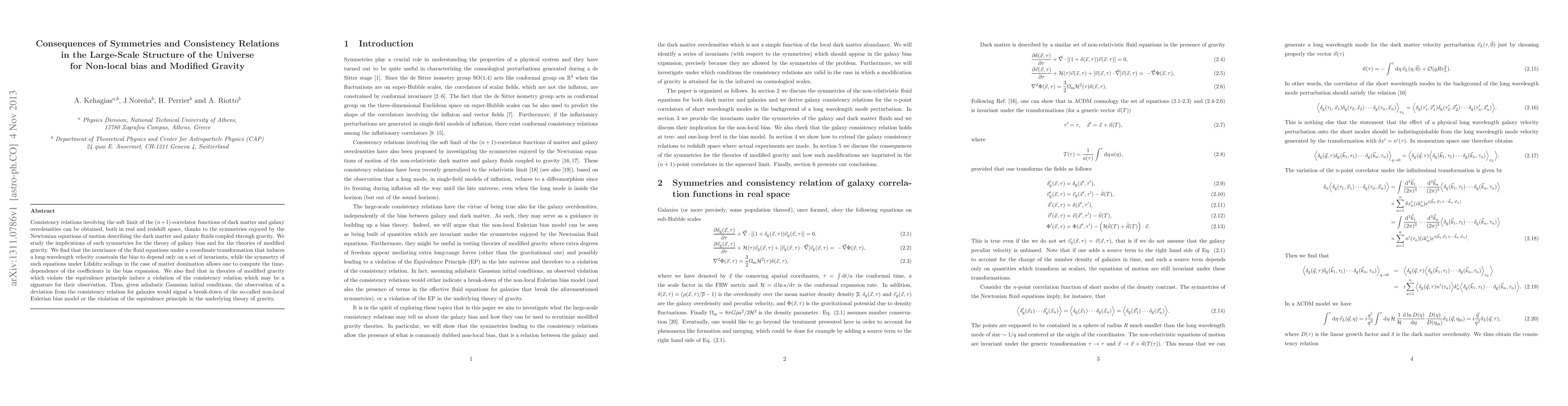 This paper explores how symmetries in the equations governing dark matter and galaxy dynamics lead to consistency relations in the large-scale structure of the universe. It finds that these symmetries constrain galaxy bias and reveal potential signatures of modified gravity theories that violate the equivalence principle.