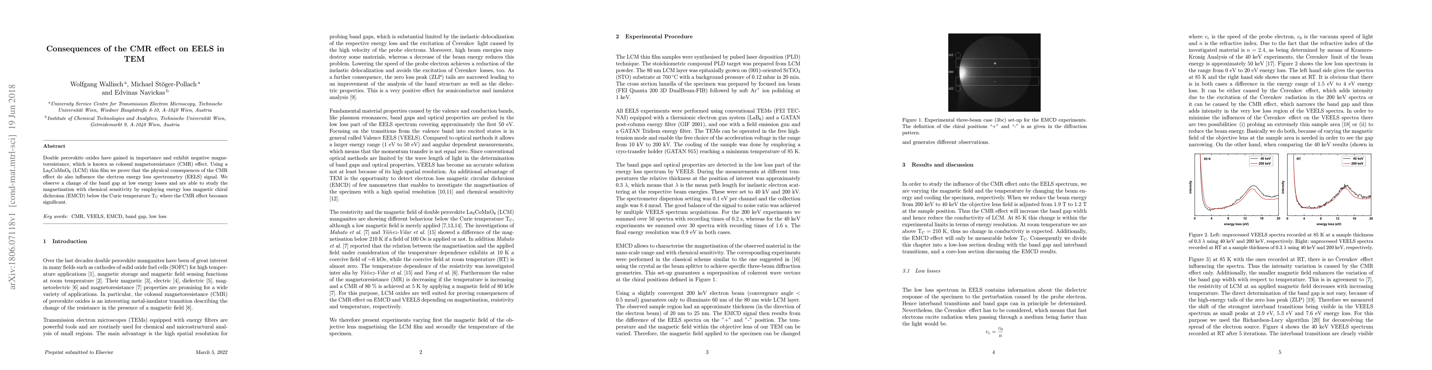 Double perovskite oxides have gained in importance and exhibit negative magnetoresistance, which is known as colossal magnetoresistance (CMR) effect. Using a La$_2$CoMnO$_6$ (LCM) thin film we prove that the physical consequences of the CMR effect do also influence the electron energy loss spectrometry (EELS) signal. We observe a change of the band gap at low energy losses and are able to study the magnetisation with chemical sensitivity by employing energy loss magnetic chiral dichroism (EMCD) below the Curie temperature T$_C$ where the CMR effect becomes significant.