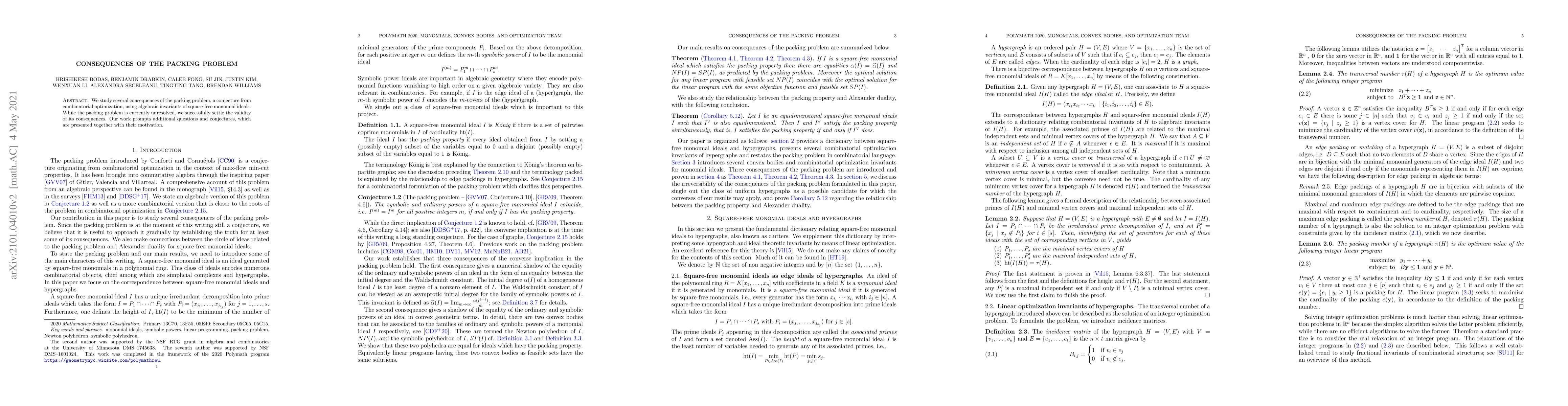 We study several consequences of the packing problem, a conjecture from combinatorial optimization, using algebraic invariants of square-free monomial ideals. While the packing problem is currently unresolved, we successfully settle the validity of its consequences. Our work prompts additional questions and conjectures, which are presented together with their motivation.