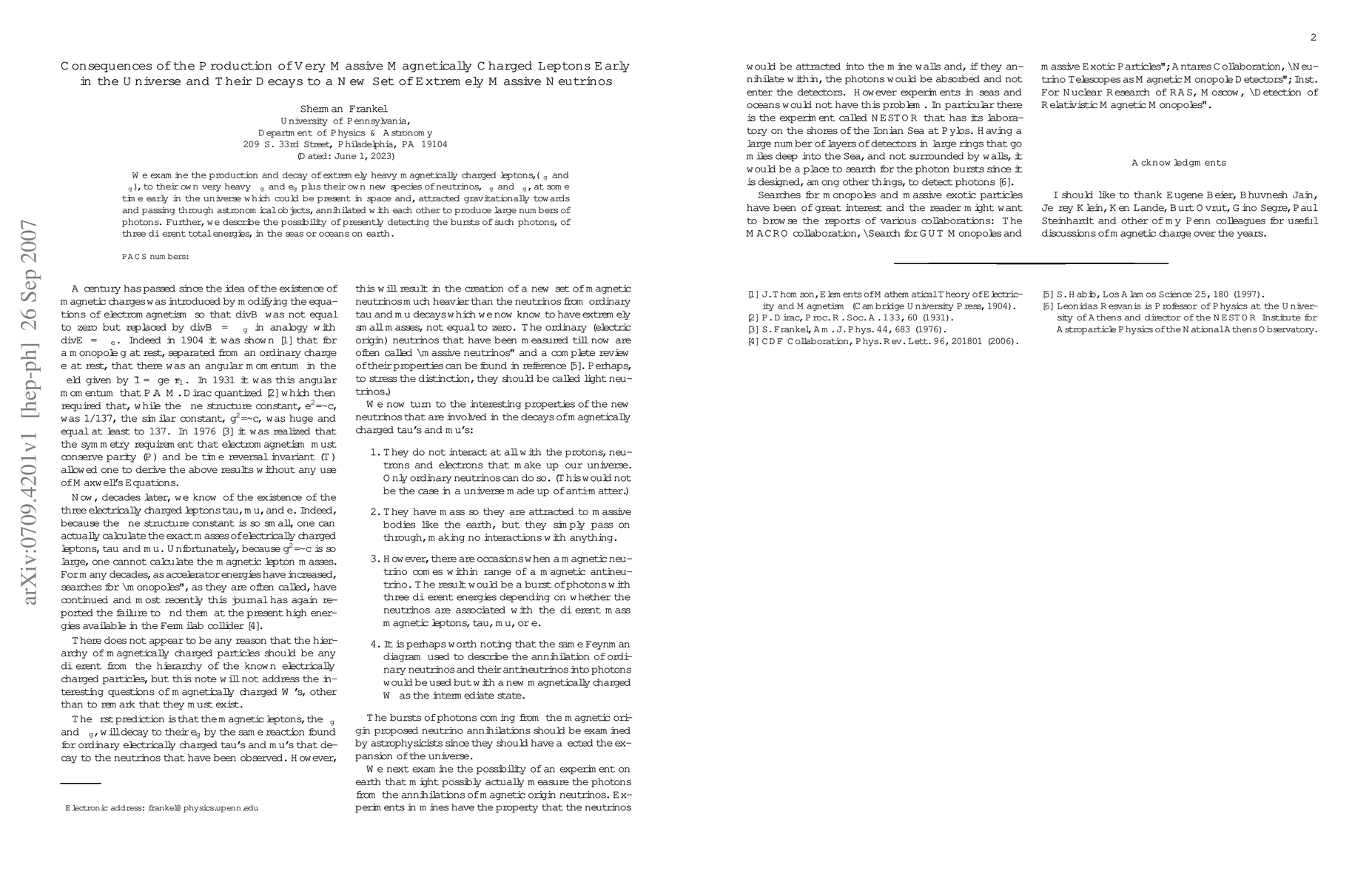 We examine the production and decay of extremely heavy magnetically charged leptons, (tau_g and mu_g), to their own very heavy mu_g and e_g plus their own new species of neutrinos, nu_g and nubar_g, at some time early in the universe which could be present in space and, attracted gravitationally towards and passing through astronomical objects, annihilated with each other to produce large numbers of photons. Further, we describe the possibility of presently detecting the bursts of such photons, of three different total energies, in the seas or oceans on earth.