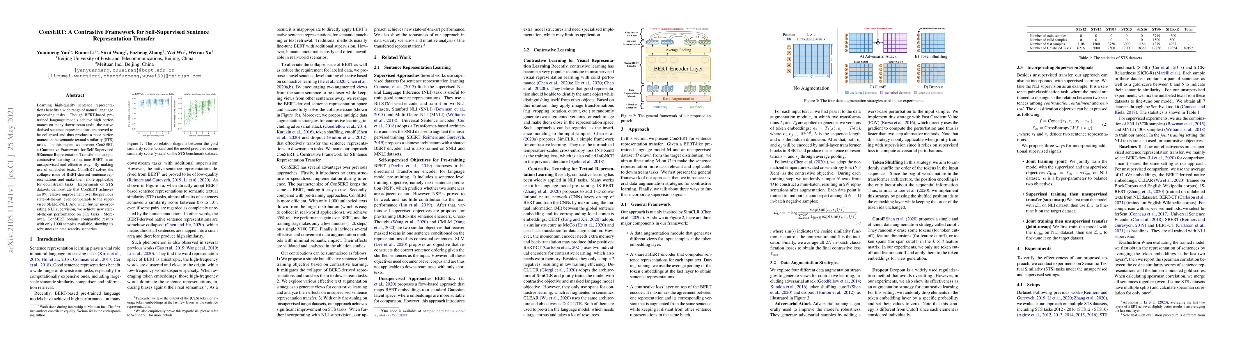 ConSERT is a self-supervised framework for enhancing BERT-based sentence representations using contrastive learning on unlabeled texts, addressing the collapse issue and improving performance on semantic textual similarity tasks. It achieves an 8% relative improvement over the previous best method and demonstrates robustness even with limited labeled data.