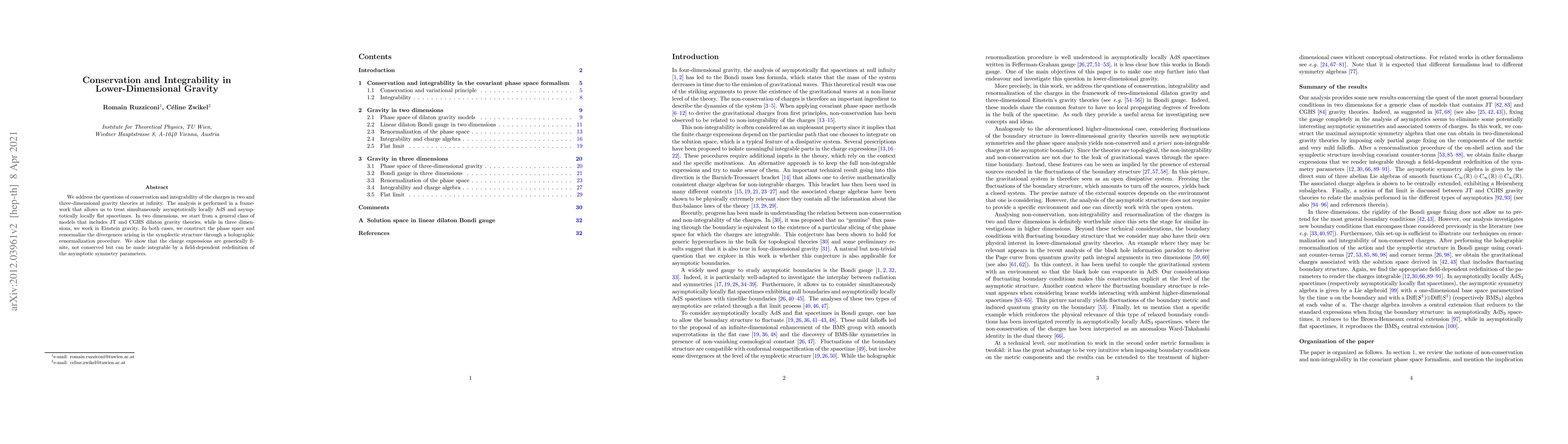 We address the questions of conservation and integrability of the charges in two and three-dimensional gravity theories at infinity. The analysis is performed in a framework that allows us to treat simultaneously asymptotically locally AdS and asymptotically locally flat spacetimes. In two dimensions, we start from a general class of models that includes JT and CGHS dilaton gravity theories, while in three dimensions, we work in Einstein gravity. In both cases, we construct the phase space and renormalize the divergences arising in the symplectic structure through a holographic renormalization procedure. We show that the charge expressions are generically finite, not conserved but can be made integrable by a field-dependent redefinition of the asymptotic symmetry parameters.