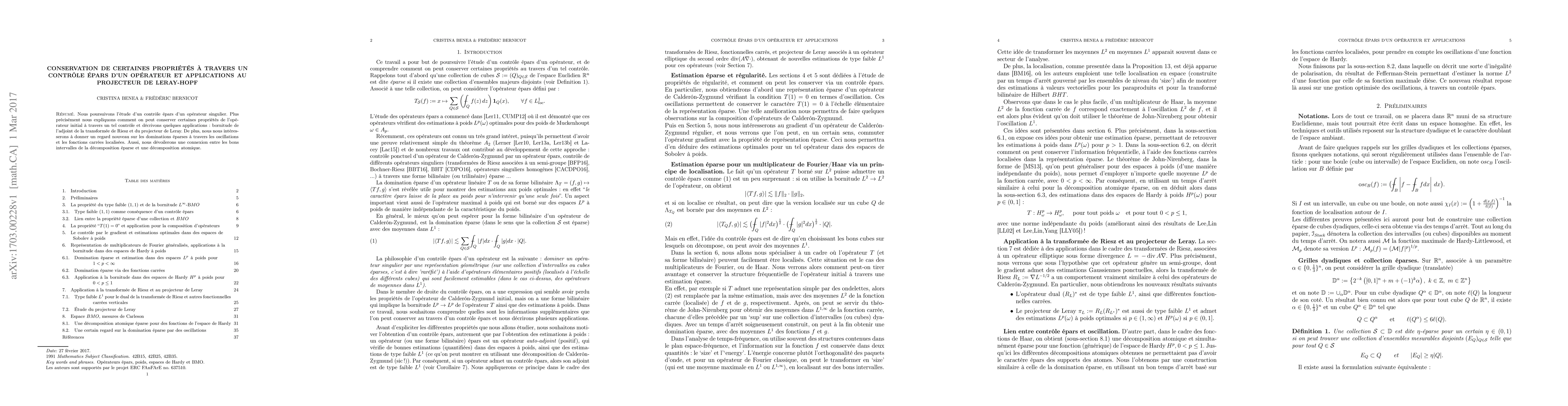 Nous poursuivons l'\'etude d'un contr\^ole \'epars d'un op\'erateur singulier. Plus pr\'ecis\'ement nous expliquons comment on peut conserver certaines propri\'et\'es de l'op\'erateur initial \`a travers un tel contr\^ole et d\'ecrivons quelques applications: bornitude de l'adjoint de la transform\'ee de Riesz et du projecteur de Leray. De plus, nous nous int\'eresserons \`a donner un regard nouveau sur les dominations \'eparses \`a travers les oscillations et les fonctions carr\'ees localis\'ees. Aussi, nous d\'evoilerons une connexion entre les bons intervalles de la d\'ecomposition \'eparse et une d\'ecomposition atomique. We pursue the study of a sparse control for a singular operator. More precisely, we describe how one can track some properties of the initial operator, through such a control and describe also some applications: boundedness of the adjoint of a Riesz transform and of the Leray projector. Moreover, we will be interested in giving a new insight on the sparse domination through the oscillations and the localized square functions. Also, we will reveal a connection between the good intervals of the sparse domination and the atomic decomposition for a function in a Hardy space.