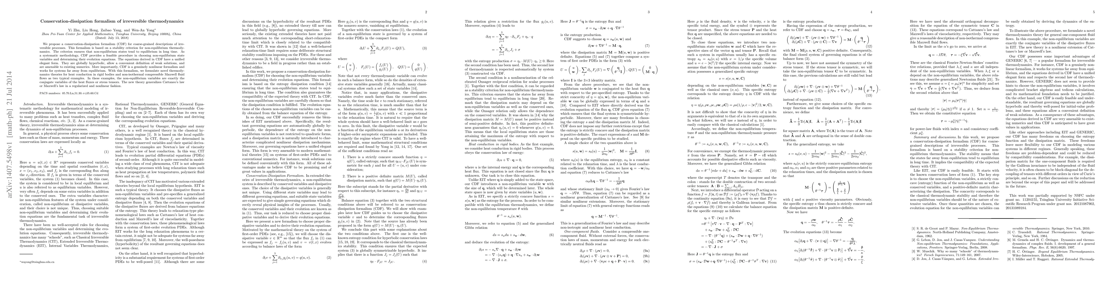 The paper proposes a conservation-dissipation formalism (CDF) for describing irreversible processes, ensuring stability and equilibrium tendency. CDF provides a systematic approach for selecting non-equilibrium state variables and deriving their evolution equations, applicable to systems far from equilibrium, and formulates new thermodynamics theories for heat conduction and fluid flows.