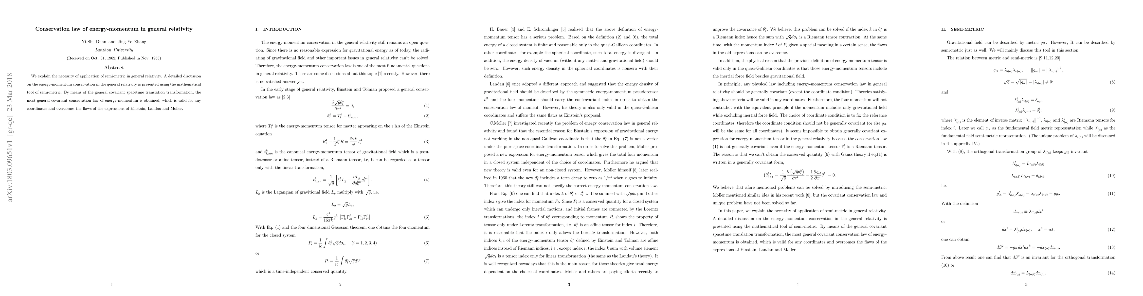 We explain the necessity of application of semi-metric in general relativity. A detailed discussion on the energy-momentum conservation in the general relativity is presented using the mathematical tool of semi-metric. By means of the general covariant spacetime translation transformation, the most general covariant conservation law of energy-momentum is obtained, which is valid for any coordinates and overcomes the flaws of the expressions of Einstain, Landau and Moller.