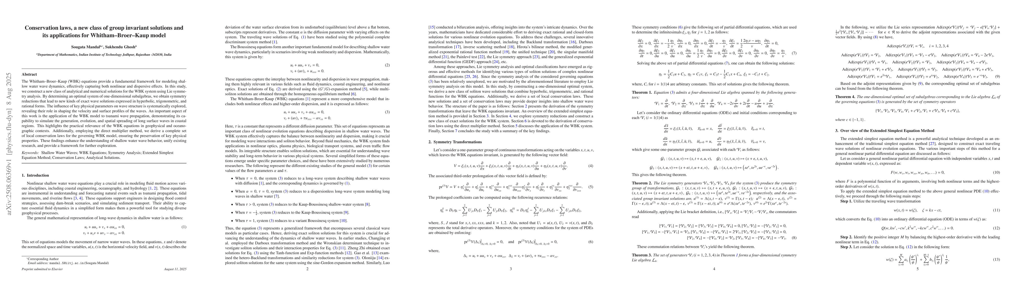 The Whitham Broer Kaup (WBK) equations provide a fundamental framework for modeling shallow water wave dynamics, effectively capturing both nonlinear and dispersive effects. In this study, we construct a new class of analytical and numerical solutions for the WBK system using Lie symmetry analysis. By determining an optimal system of one-dimensional subalgebras, we obtain symmetry reductions that lead to new kinds of exact wave solutions expressed in hyperbolic, trigonometric, and rational forms. The influence of key physical parameters on wave structure is systematically explored, revealing their role in shaping the velocity and surface profiles of the waves. An important aspect of this work is the application of the WBK model to tsunami wave propagation, demonstrating its capability to simulate the generation, evolution, and spatial spreading of long surface waves in coastal regions. This highlights the practical relevance of the WBK equations in geophysical and oceanographic contexts. Additionally, employing the direct multiplier method, we derive a complete set of local conservation laws for the governing WBK model, ensuring the preservation of key physical properties. These findings enhance the understanding of shallow water wave behavior, unify existing research, and provide a framework for further exploration.