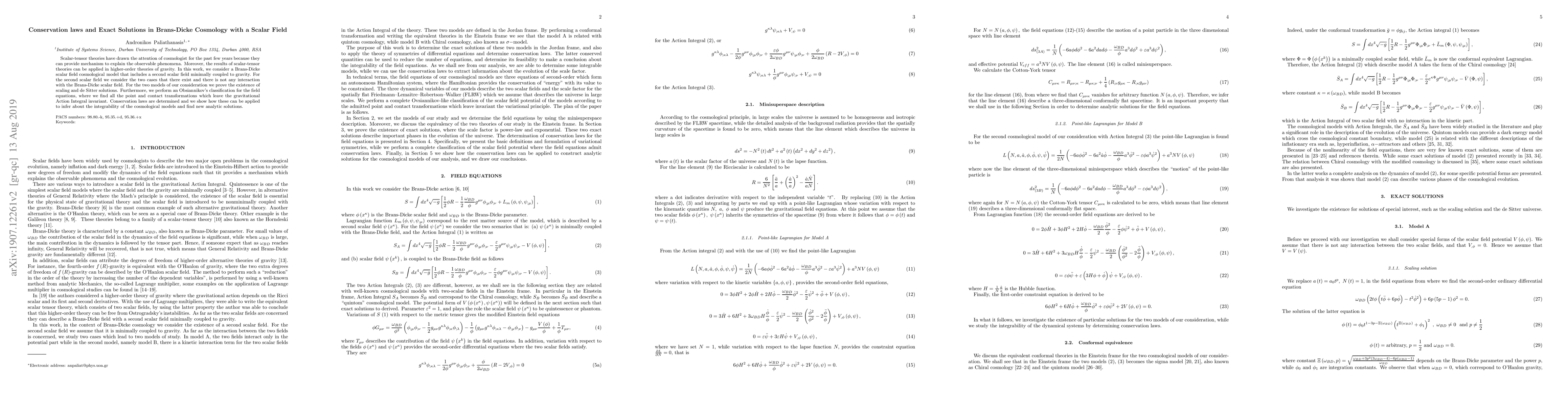 This paper explores Brans-Dicke cosmology with a scalar field, proving the existence of scaling and de Sitter solutions. It also classifies field equations using Obsiannikov's method, determines conservation laws, and applies these to find new analytic solutions and infer integrability.
