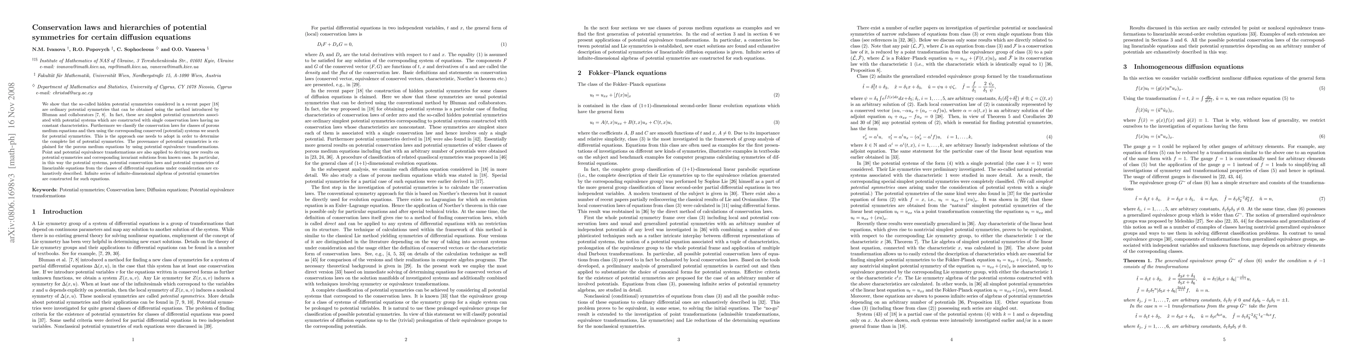 This paper explores hidden potential symmetries in diffusion equations, showing they are ordinary potential symmetries obtainable via the Bluman method. It classifies conservation laws for porous medium equations and exhaustively describes potential symmetries, conservation laws, and invariant solutions, constructing infinite-dimensional algebras of potential symmetries.
