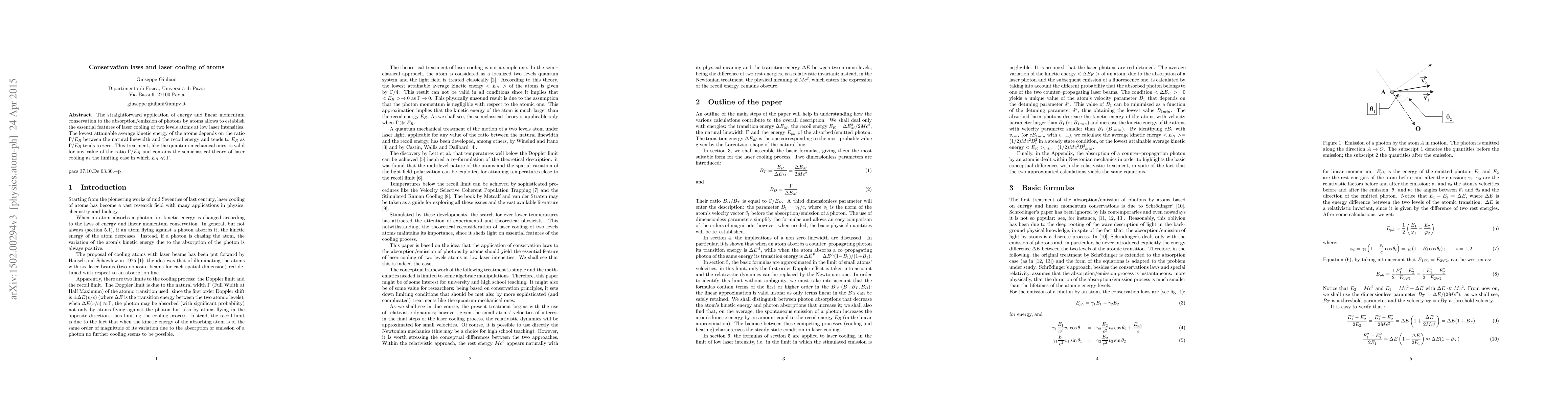 This paper explores laser cooling of atoms by applying energy and linear momentum conservation to photon absorption/emission, demonstrating how the lowest attainable average kinetic energy depends on the ratio of natural linewidth to recoil energy, tending to the recoil energy as this ratio approaches zero. It encompasses both semiclassical and quantum mechanical treatments, valid for all ratios of these quantities.
