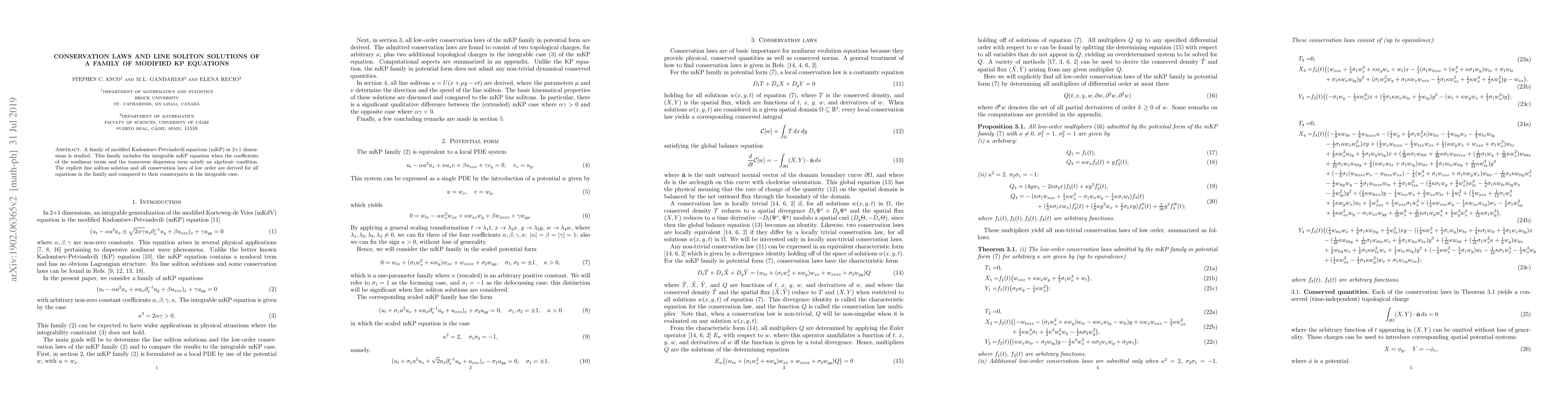 A family of modified Kadomtsev-Petviashvili equations (mKP) in 2+1 dimensions is studied. This family includes the integrable mKP equation when the coefficients of the nonlinear terms and the transverse dispersion term satisfy an algebraic condition. The explicit line soliton solution and all conservation laws of low order are derived for all equations in the family and compared to their counterparts in the integrable case.