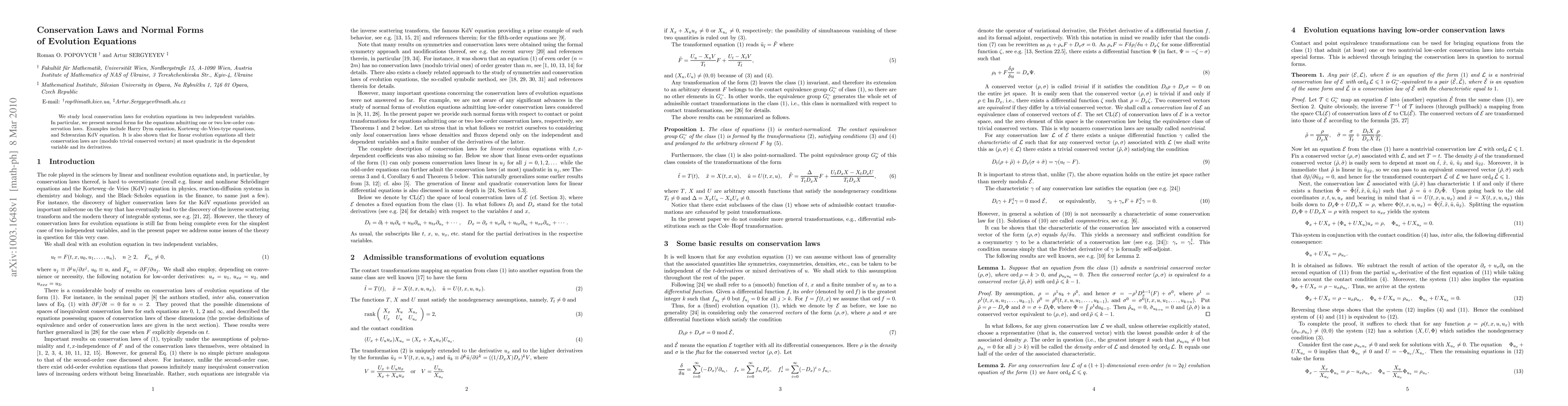 This paper explores local conservation laws for evolution equations with two independent variables, presenting normal forms for equations with one or two low-order conservation laws, including the Harry Dym, KdV-type, and Schwarzian KdV equations. It concludes that for linear evolution equations, all conservation laws are at most quadratic in the dependent variable and its derivatives.