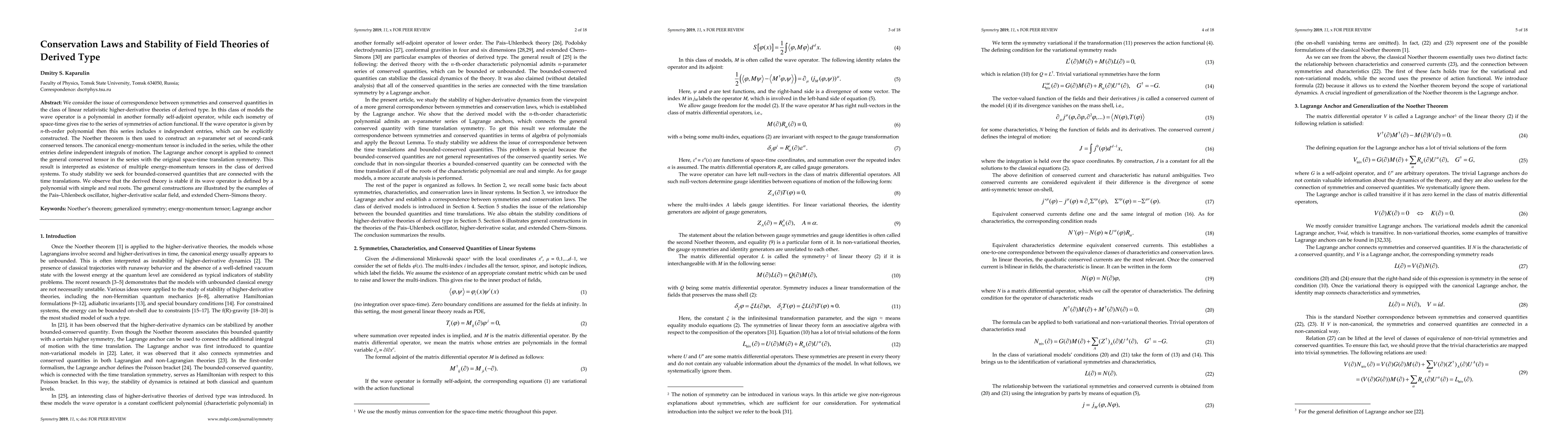 We consider the issue of correspondence between symmetries and conserved quantities in the class of linear relativistic higher-derivative theories of derived type. In this class of models the wave operator is a polynomial in another formally self-adjoint operator, while each isometry of space-time gives rise to the series of symmetries of action functional. If the wave operator is given by n-th-order polynomial then this series includes n independent entries, which can be explicitly constructed. The Noether theorem is then used to construct an n-parameter set of second-rank conserved tensors. The canonical energy-momentum tensor is included in the series, while the other entries define independent integrals of motion. The Lagrange anchor concept is applied to connect the general conserved tensor in the series with the original space-time translation symmetry. This result is interpreted as existence of multiple energy-momentum tensors in the class of derived systems. To study stability we seek for bounded-conserved quantities that are connected with the time translations. We observe that the derived theory is stable if its wave operator is defined by a polynomial with simple and real roots. The general constructions are illustrated by the examples of the Pais-Uhlenbeck oscillator, higher-derivative scalar field, and extended Chern-Simons theory.